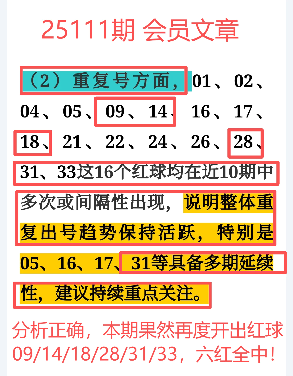 上期免费文章 + 会员文章 + 充电体验卡三线合击,共命中红球09、14、18、28、31、33共6个号码,杀号12个再次全红,命中效率提升近9倍,多维逻辑体系全面验证成功!