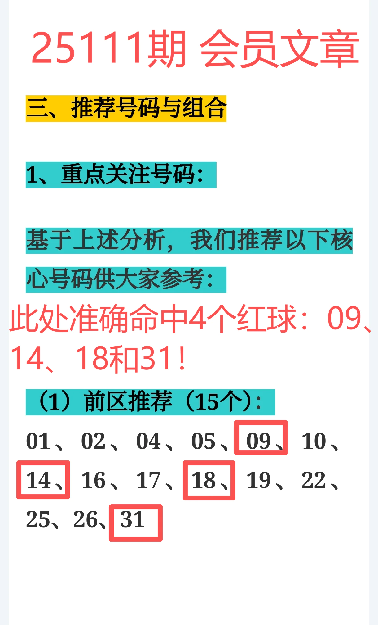 准确命中红球09、14、18、31核心号码打中4枚,重点方向果然有料!