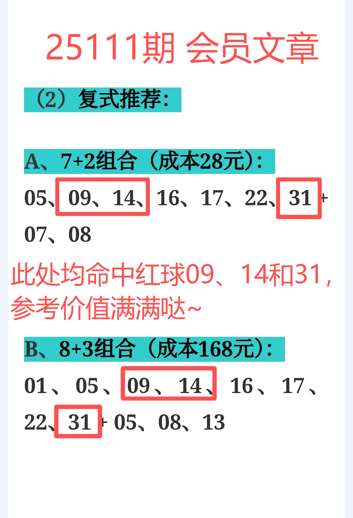 双档组合均命中09、14、31三码,若大家能搭配自身判断合理布局,想必能收获更多