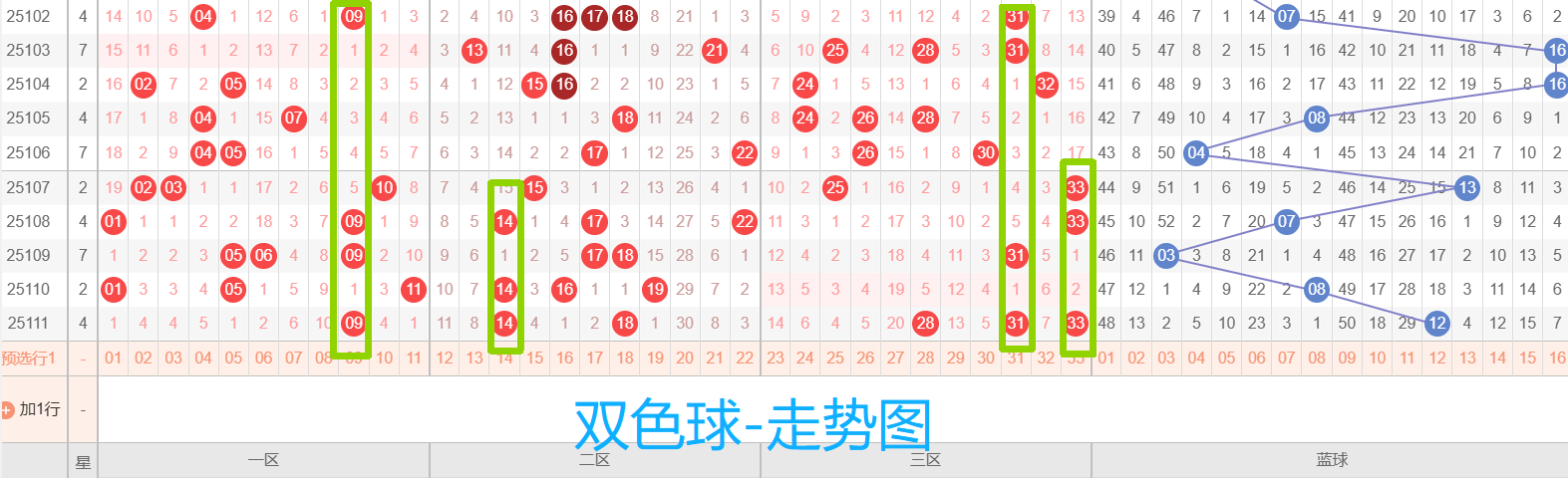 从最近10期数据来看,红球中出现频次较高的有:09(4次)、31(4次)、14(3次)、18(4次)、33(3次)等。