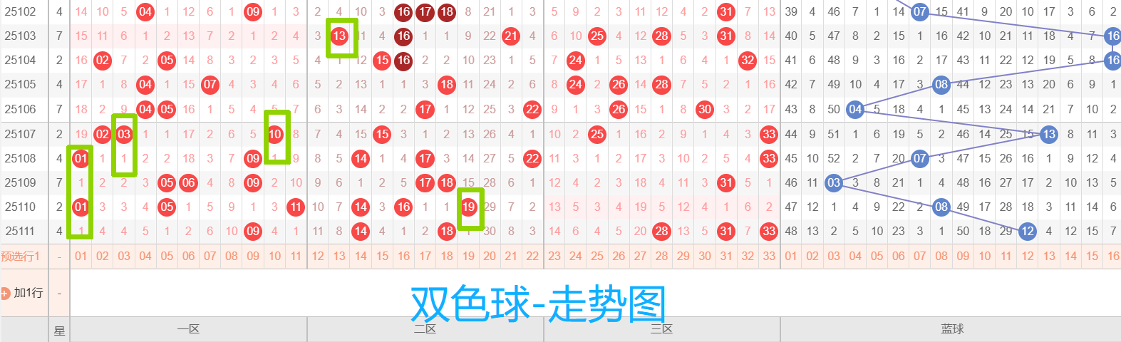 21路红球10期合计24枚,是目前最强势的路数,多次出现集中爆发,如25103期爆出5个1路号,本期建议重点关注;