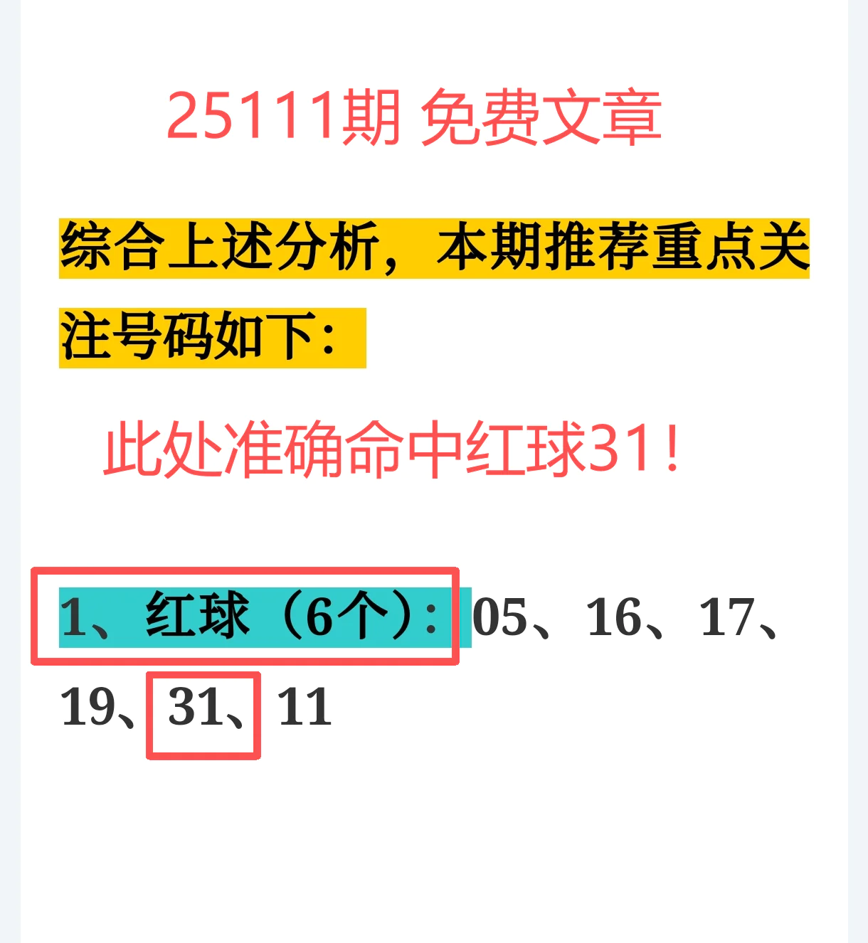 红球31再次命中,作为上期高热核心,实力再度验证,太稳了!