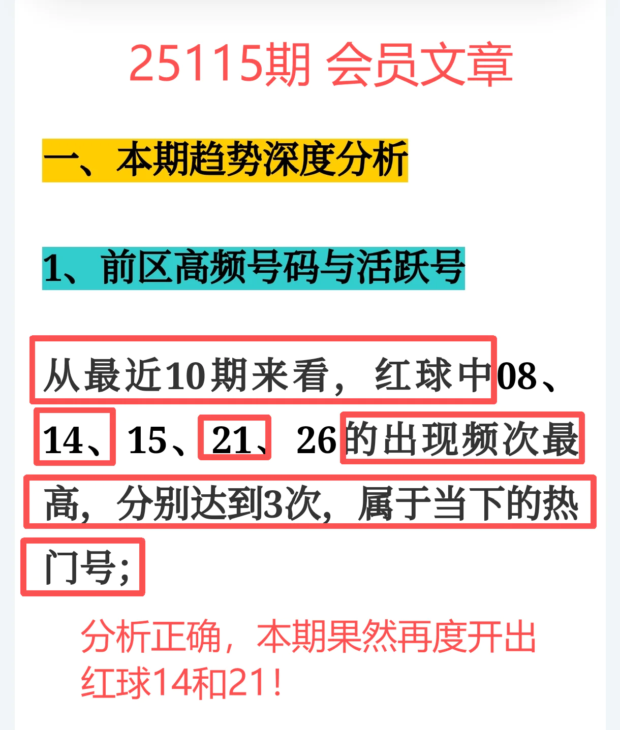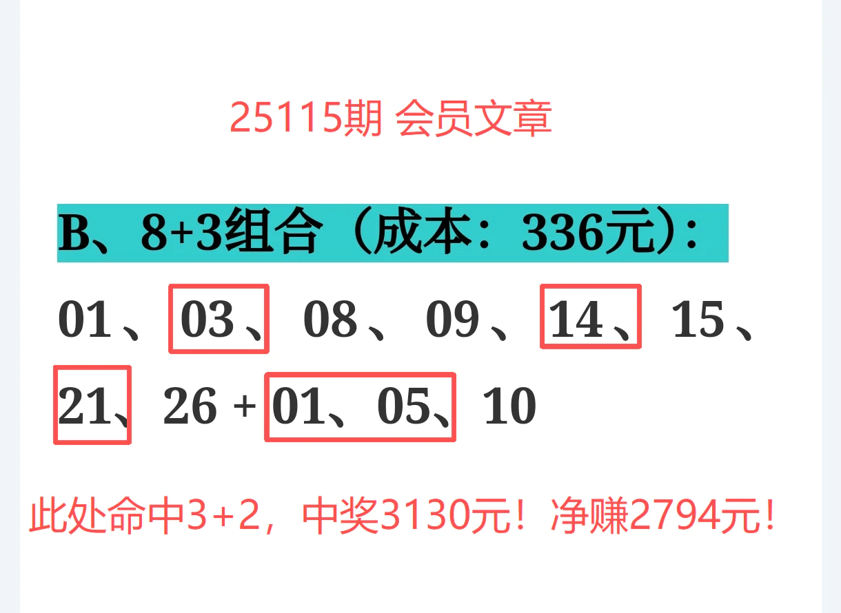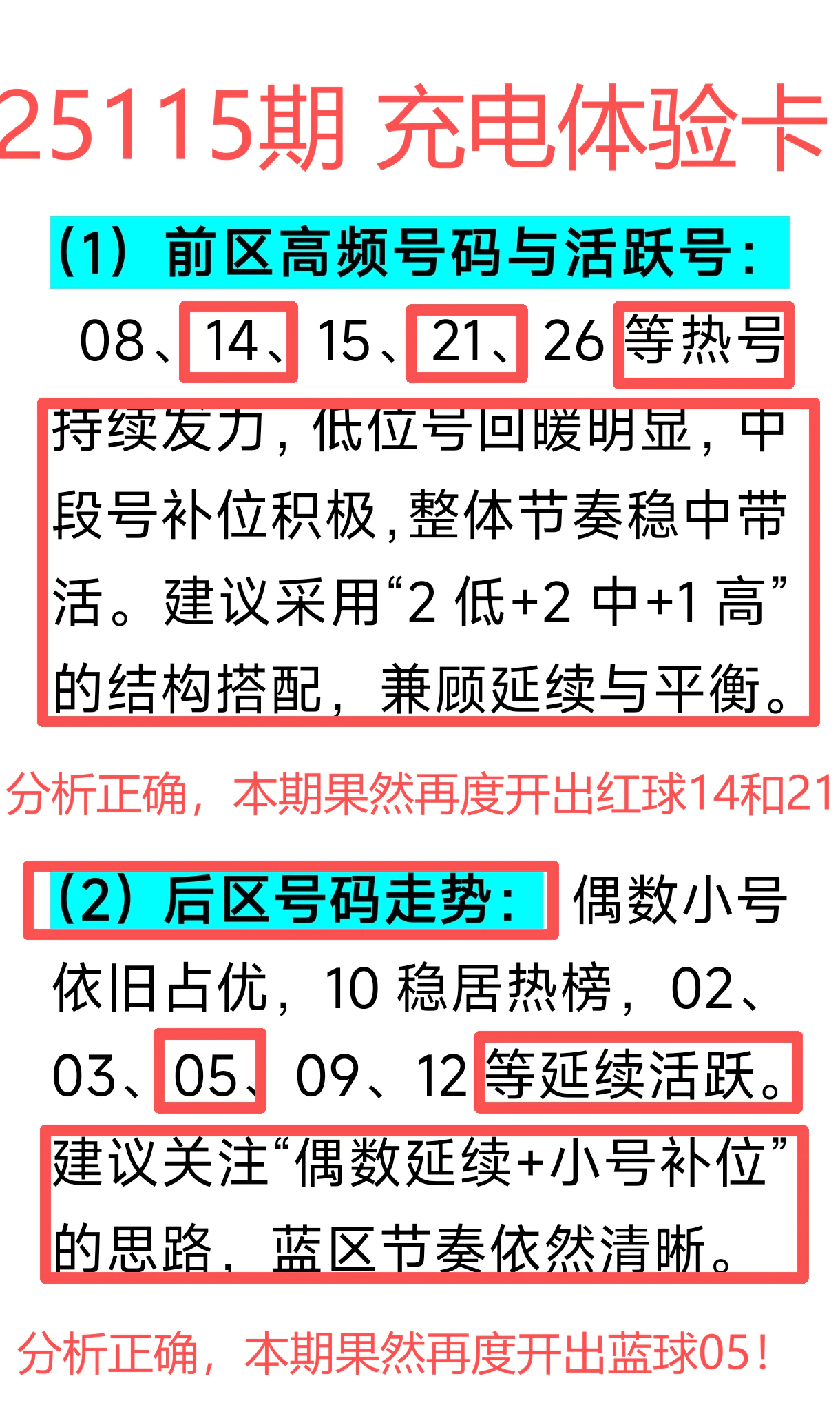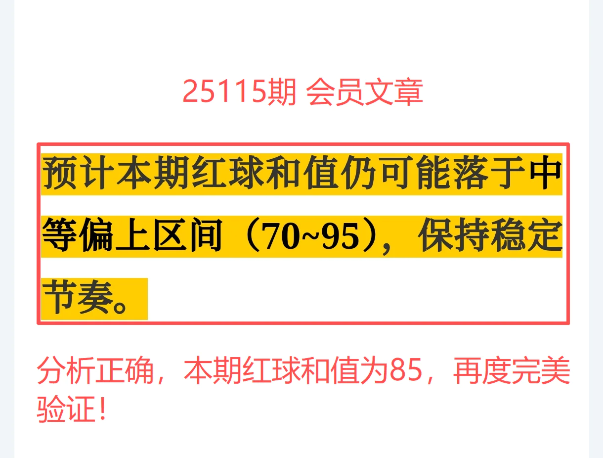 所以,上期免费文章+会员文章+充电体验卡合计共命中6个号码,尤其是会员文章的“重点关注号码”单独命中红球03、12、14、21+蓝球01、05,再加上杀号12个全红,整体趋势分析再度实现全维覆盖,精确率拉满,实战含金量十足。