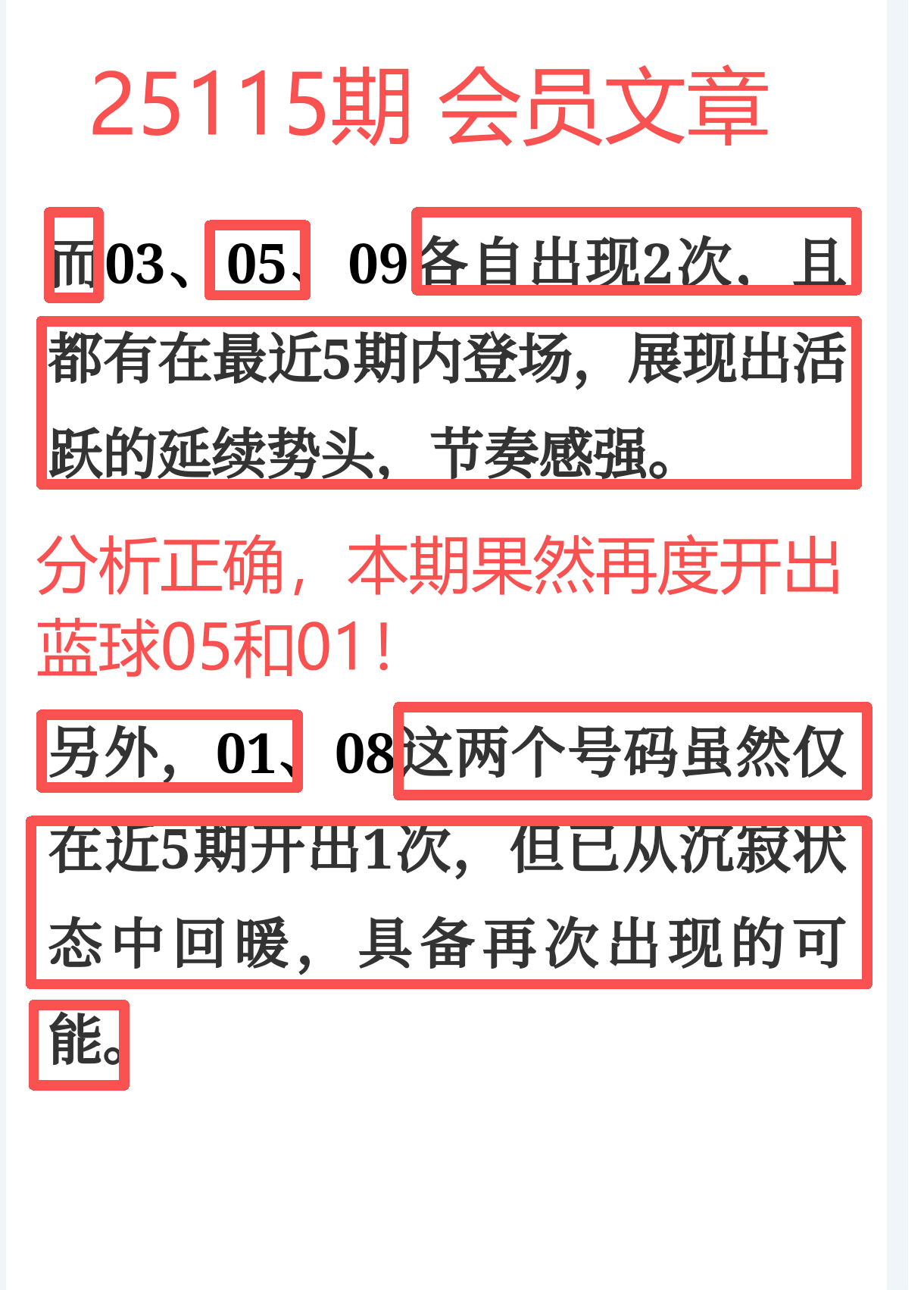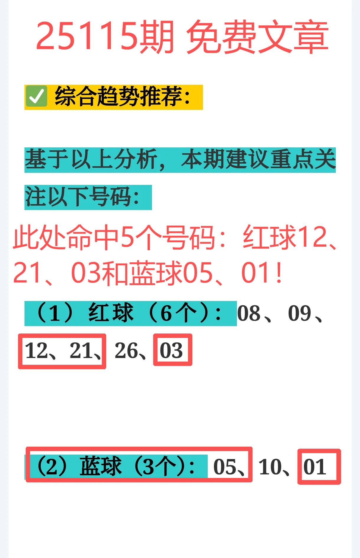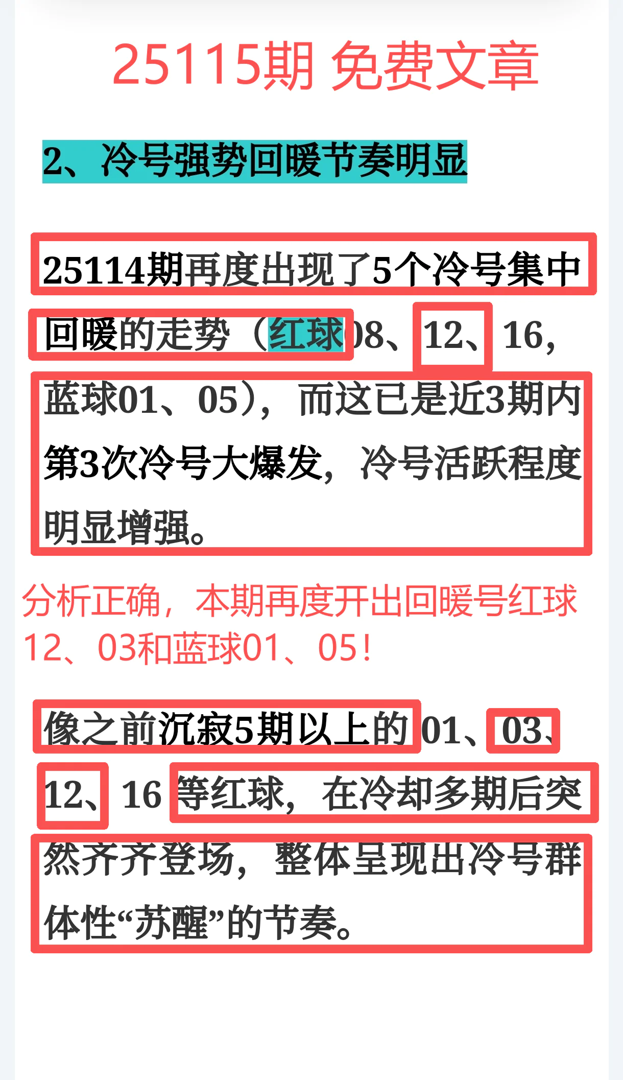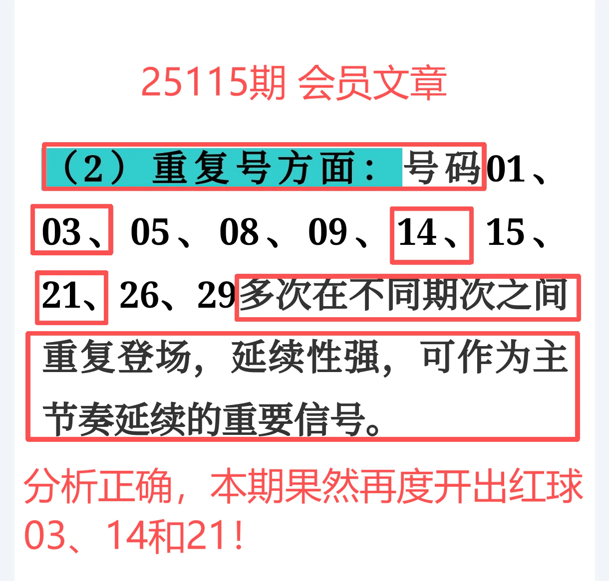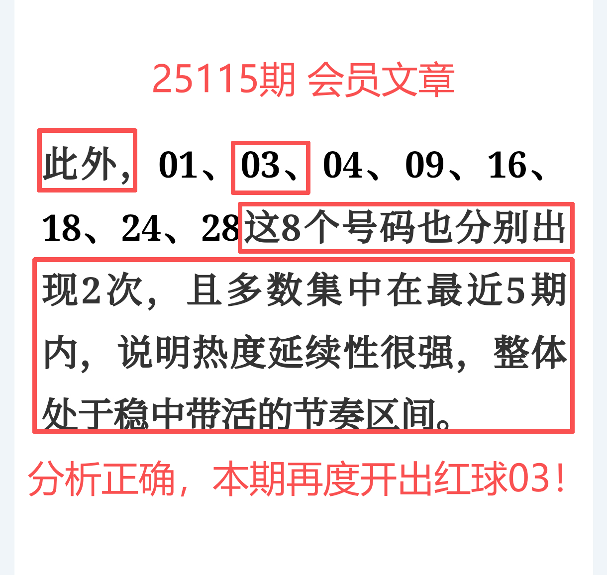 所以,上期免费文章+会员文章+充电体验卡合计共命中6个号码,尤其是会员文章的“重点关注号码”单独命中红球03、12、14、21+蓝球01、05,再加上杀号12个全红,整体趋势分析再度实现全维覆盖,精确率拉满,实战含金量十足。