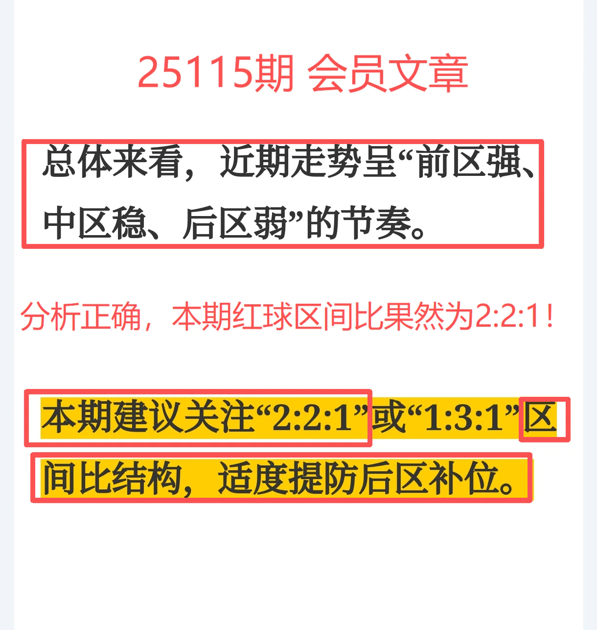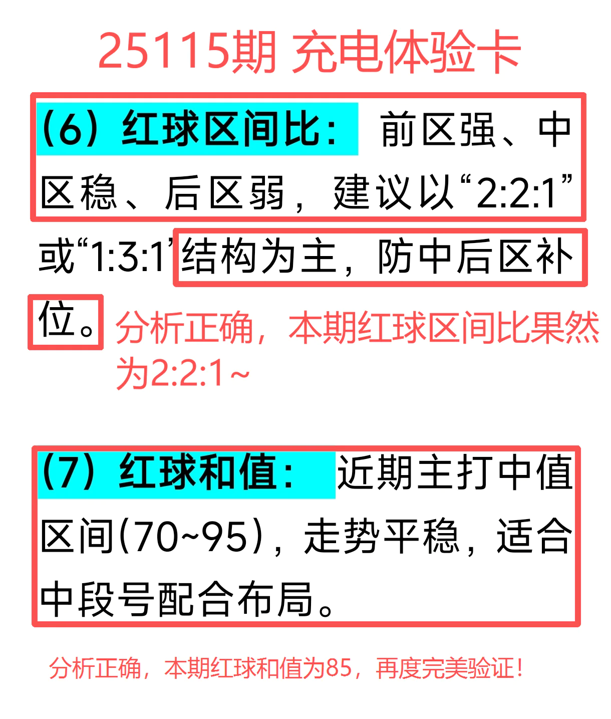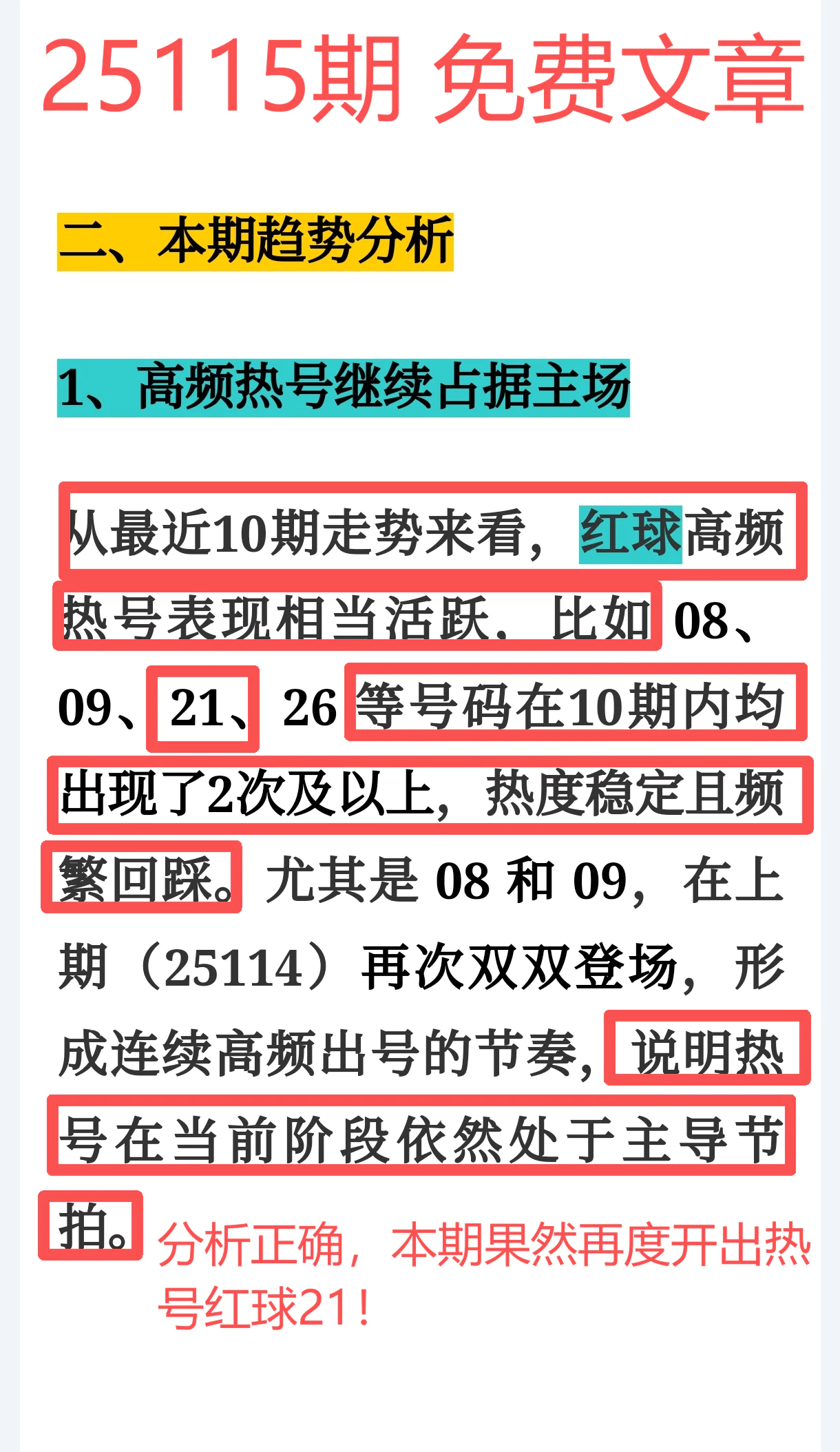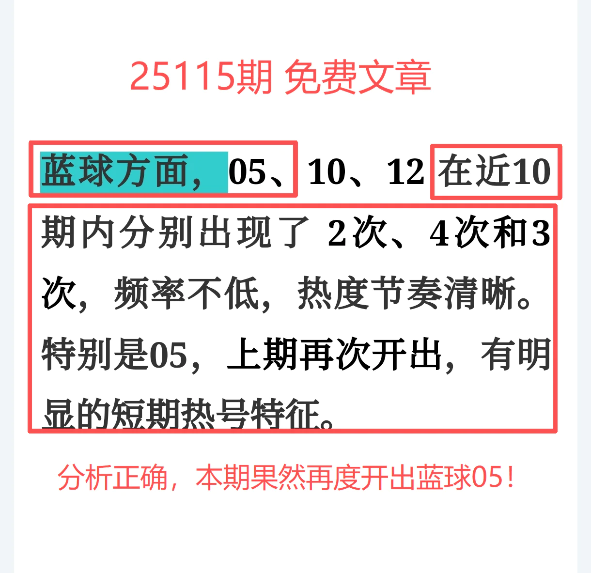 所以,上期免费文章+会员文章+充电体验卡合计共命中6个号码,尤其是会员文章的“重点关注号码”单独命中红球03、12、14、21+蓝球01、05,再加上杀号12个全红,整体趋势分析再度实现全维覆盖,精确率拉满,实战含金量十足。