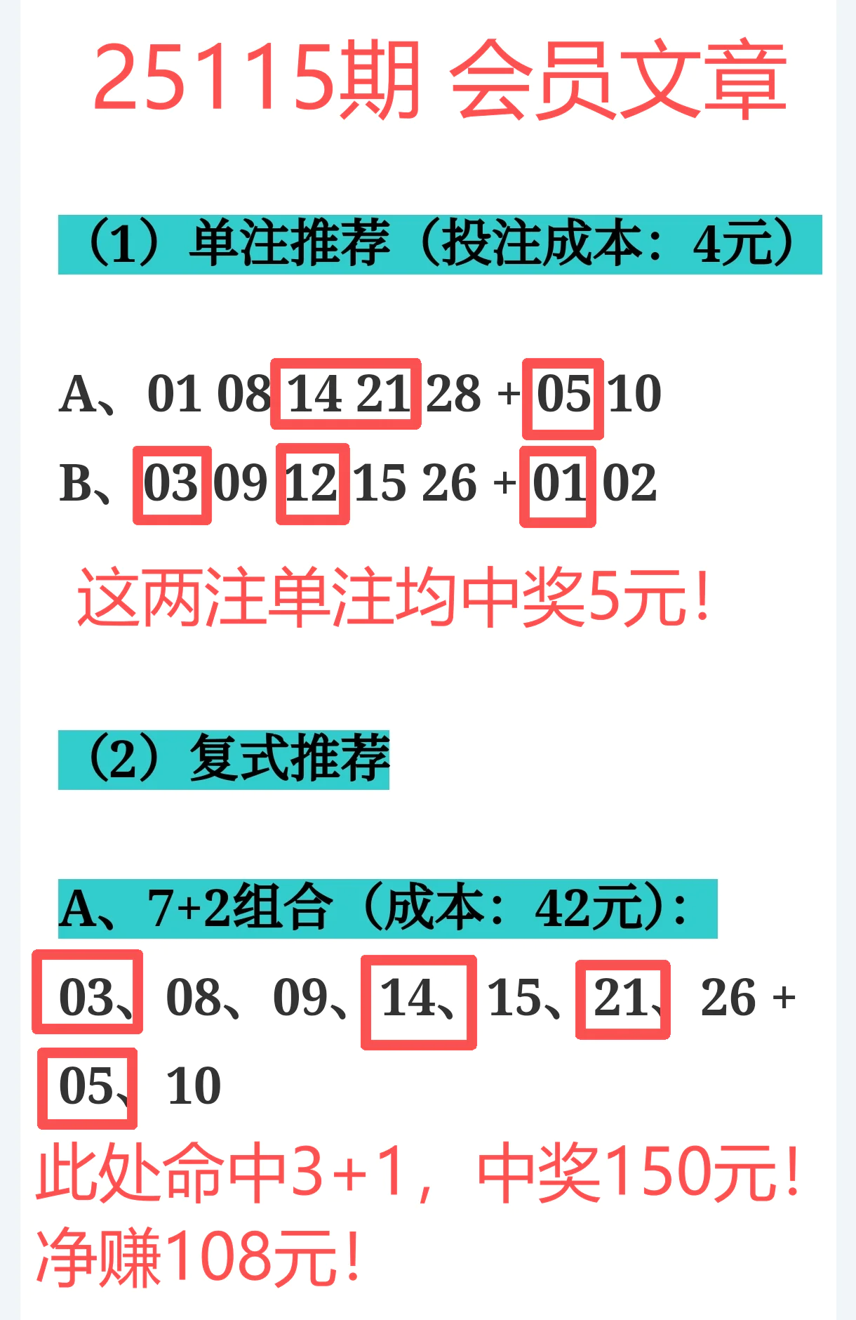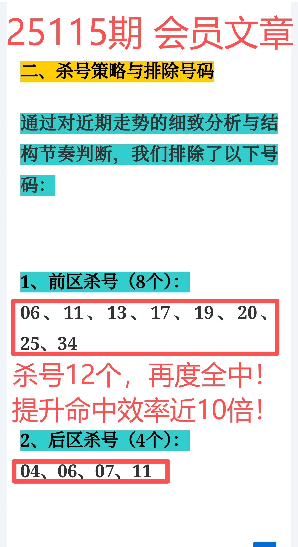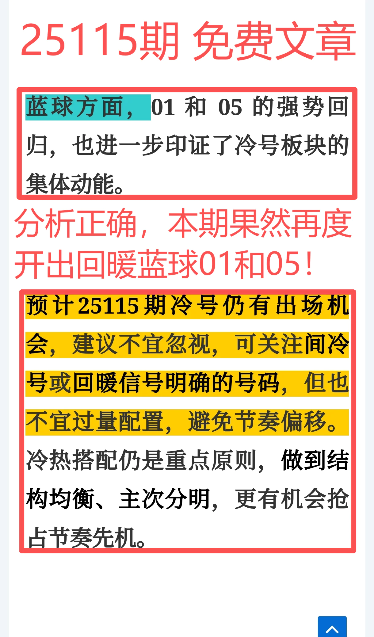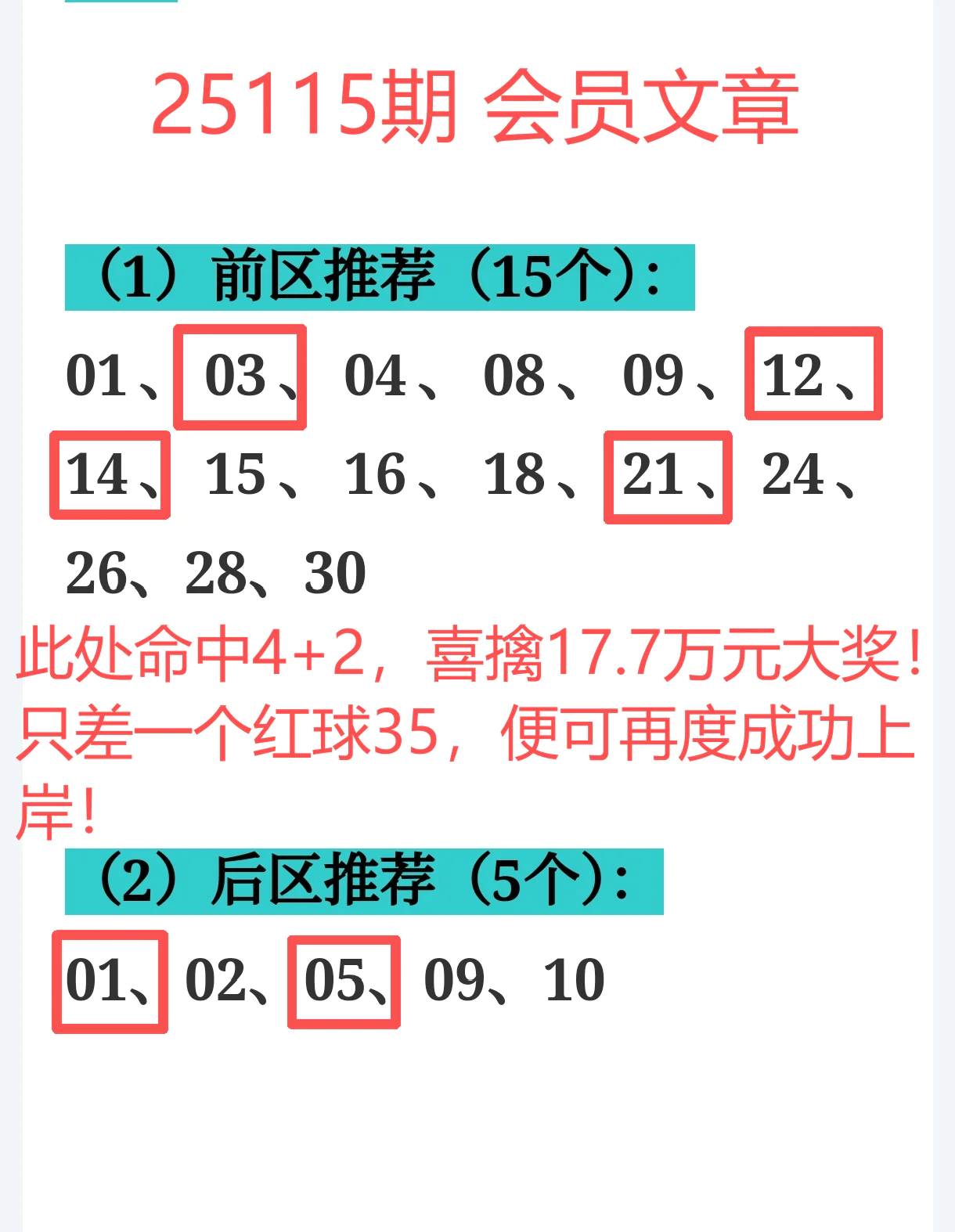 所以,上期免费文章+会员文章+充电体验卡合计共命中6个号码,尤其是会员文章的“重点关注号码”单独命中红球03、12、14、21+蓝球01、05,再加上杀号12个全红,整体趋势分析再度实现全维覆盖,精确率拉满,实战含金量十足。