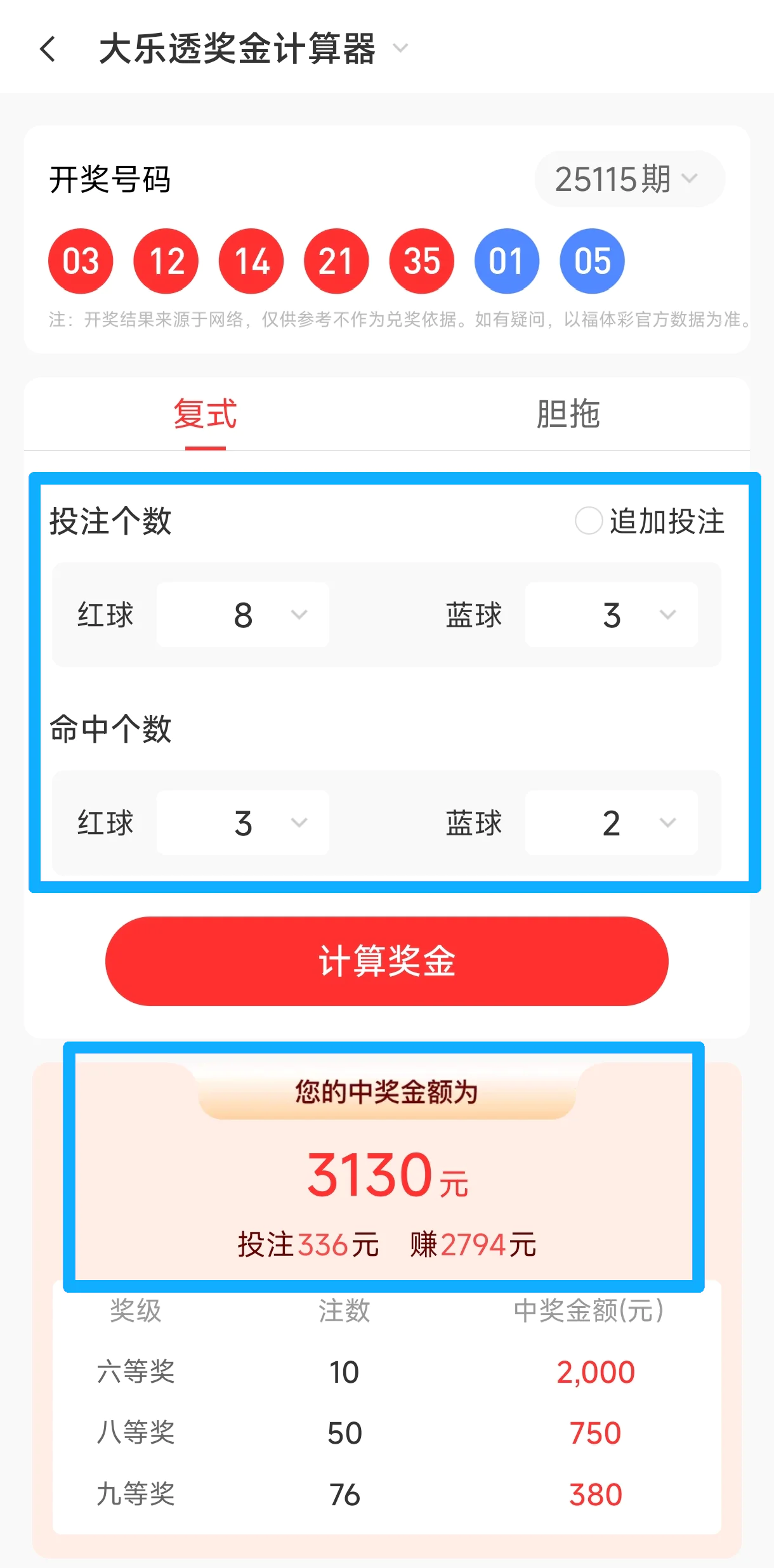 ✔ 8+3命中3+2,爆中3130元,成本336元,净赚2794元!