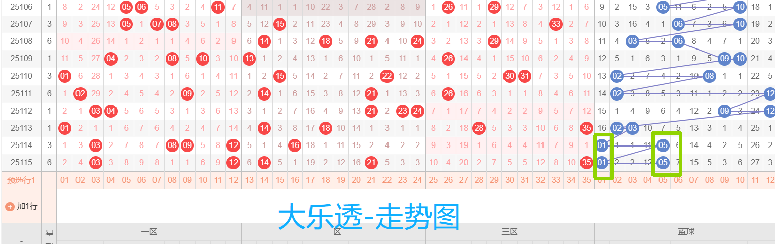 2、后区走势判断:双蓝01、05全部命中,蓝球节奏继续狂飙;