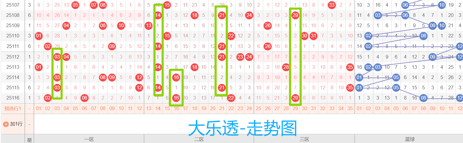 从最近10期开奖观察,红球中03、21、29、14、16等号码多次登场,特别是03、21、29,频频露脸,成为目前的绝对热号阵营。其中,29在上期(25116)再度登场,说明热势未减,短期内仍具出号延续性,建议继续保留设防。