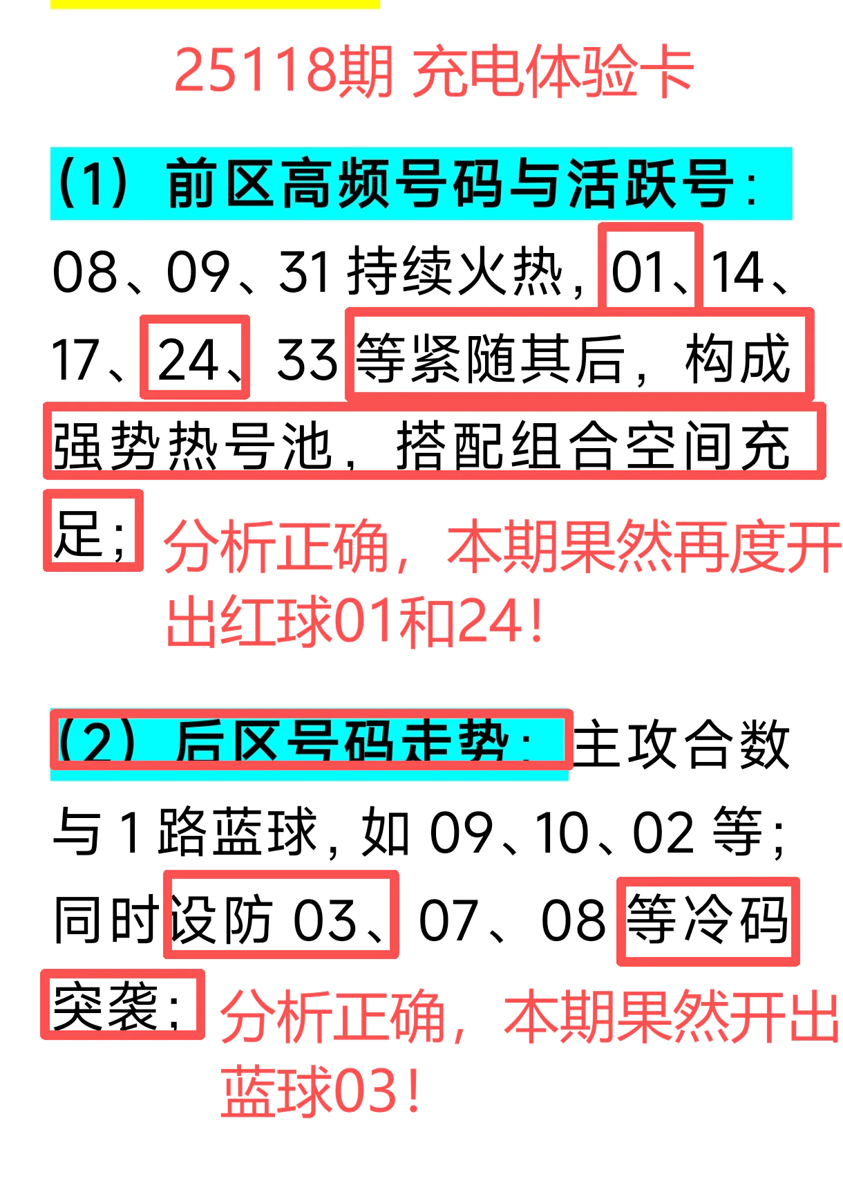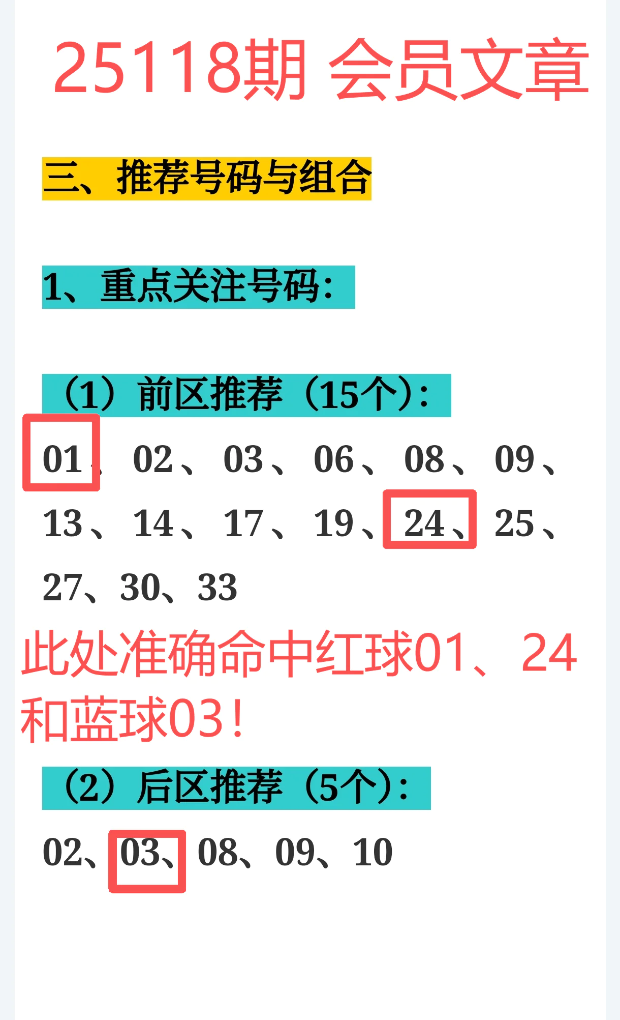 上期【免费文章 + 会员文章 + 充电体验卡】三线合力,合计命中6个号码:红球 01、10、11、16、24 + 蓝球 03!