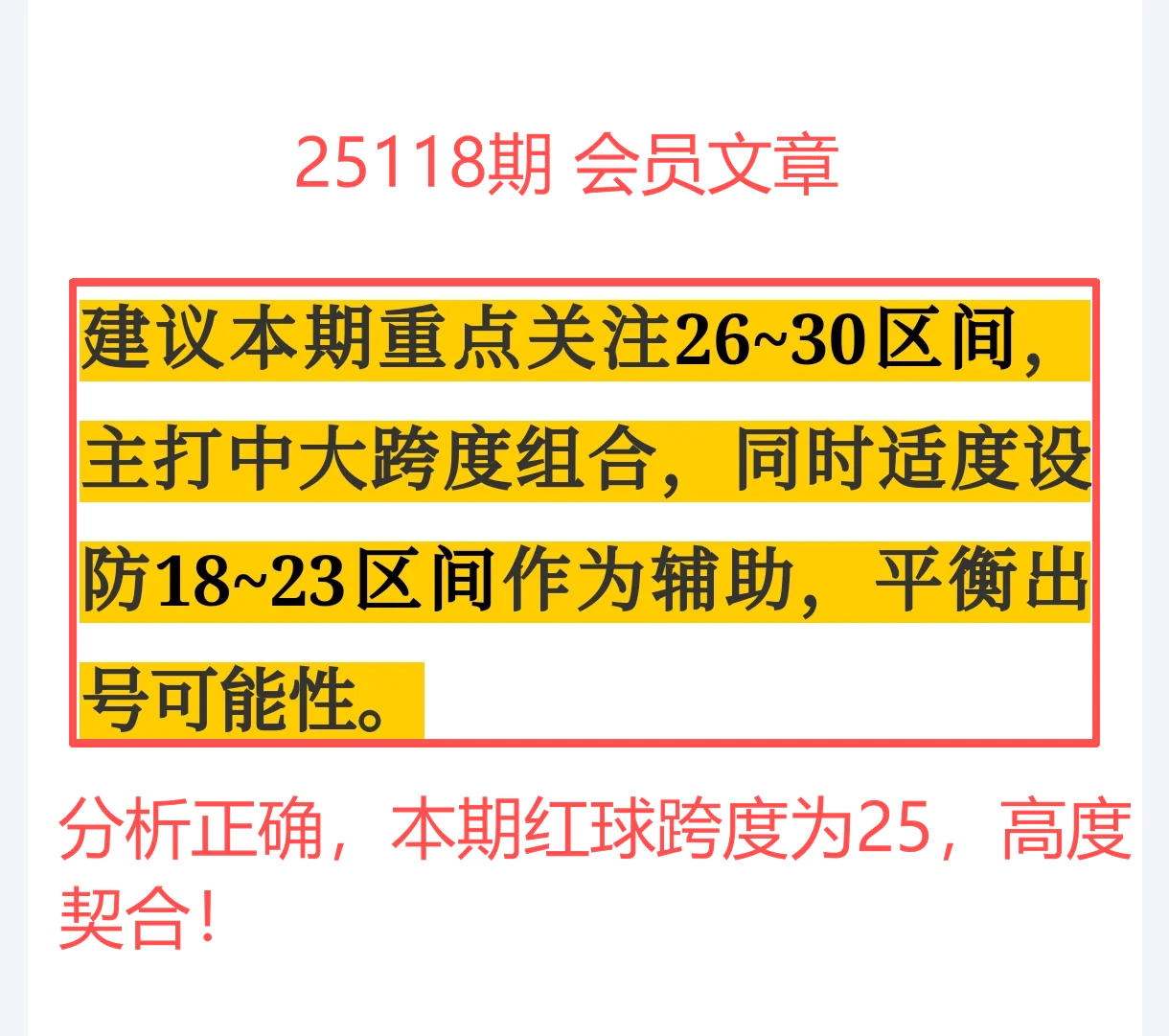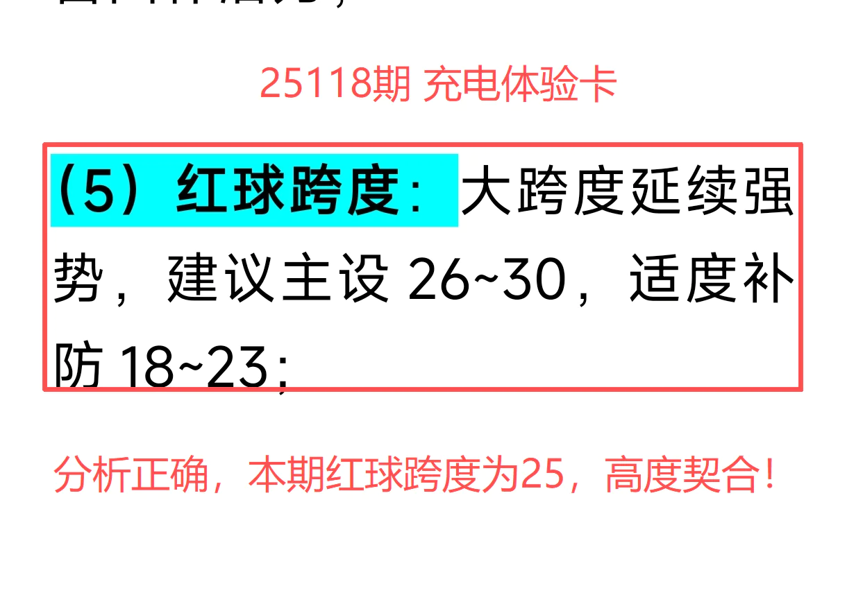 上期红球跨度为25(26-01),与我们建议的“26~30主攻区间”高度契合,跨度趋势稳稳兑现,节奏力拉满;