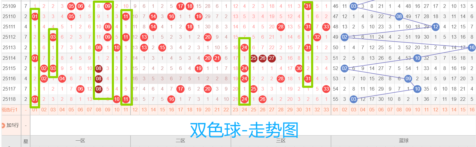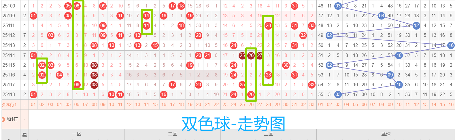 关键词:双色球、杀号、高频热号、连号和重复号、跨度、区间比、012路、质合比、冷号回暖、复式、胆码、走势