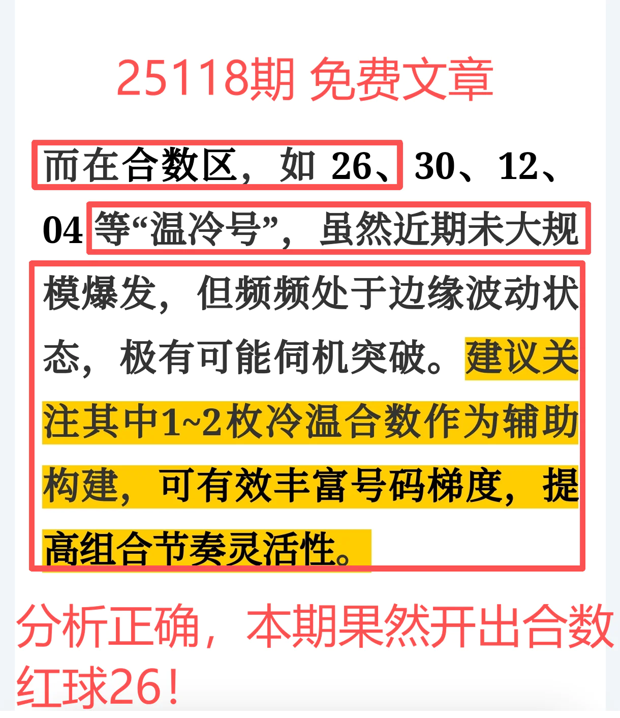 命中红球26,合数冷号成功突围,回暖点判断非常到位!