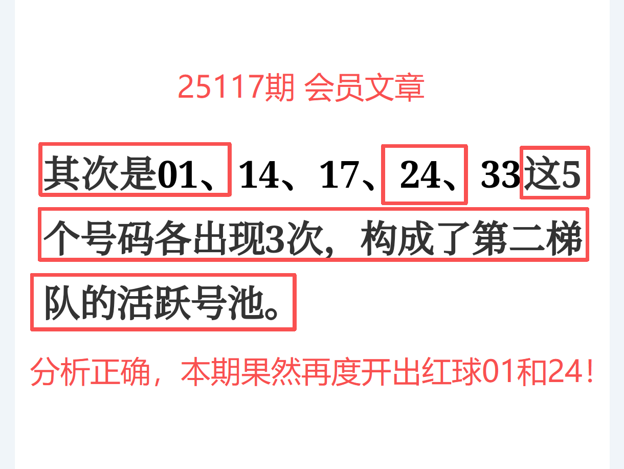命中红球01、24,重点号、热区号双双打穿,节奏稳、命中广。