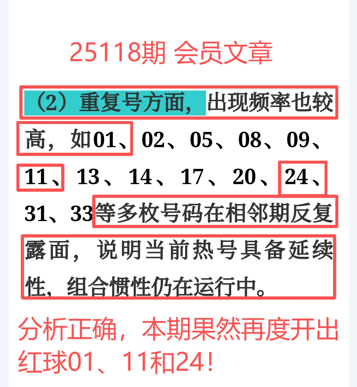 命中红球01、11、24,多枚重号集中爆发,结构预判精确落地。