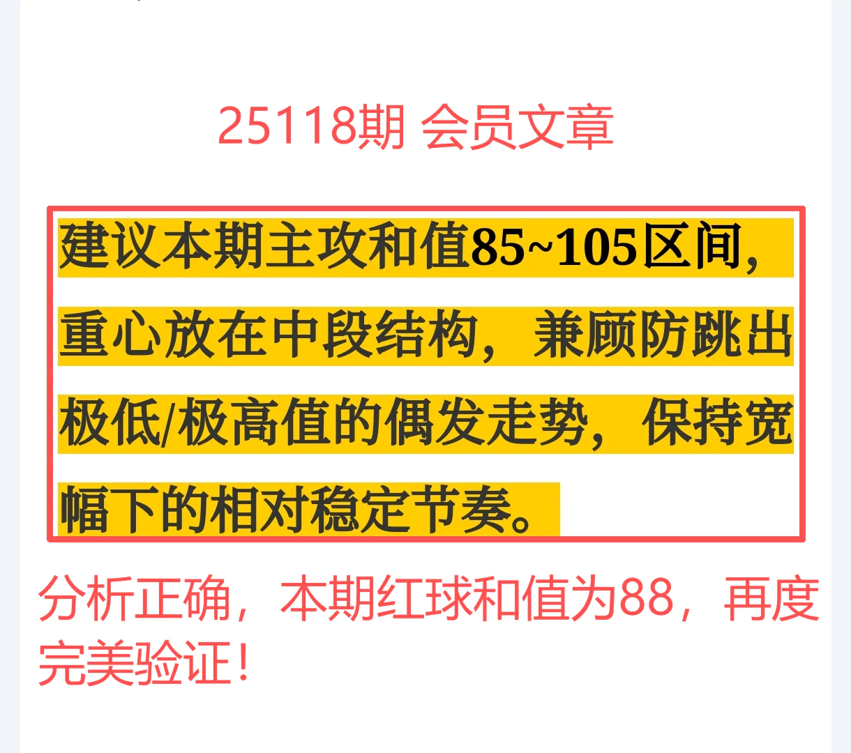 上期和值为88,稳稳落在我们建议的“85~105主攻区间”内,结构判断扎实有效。