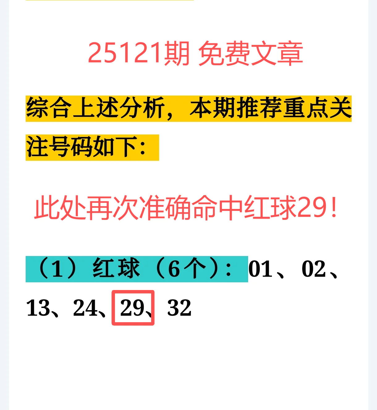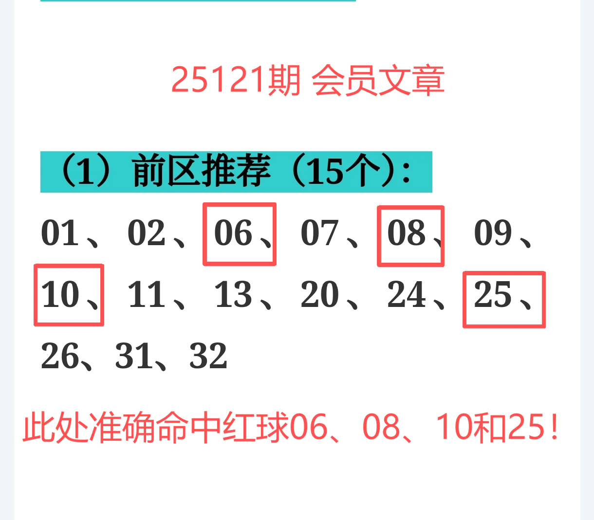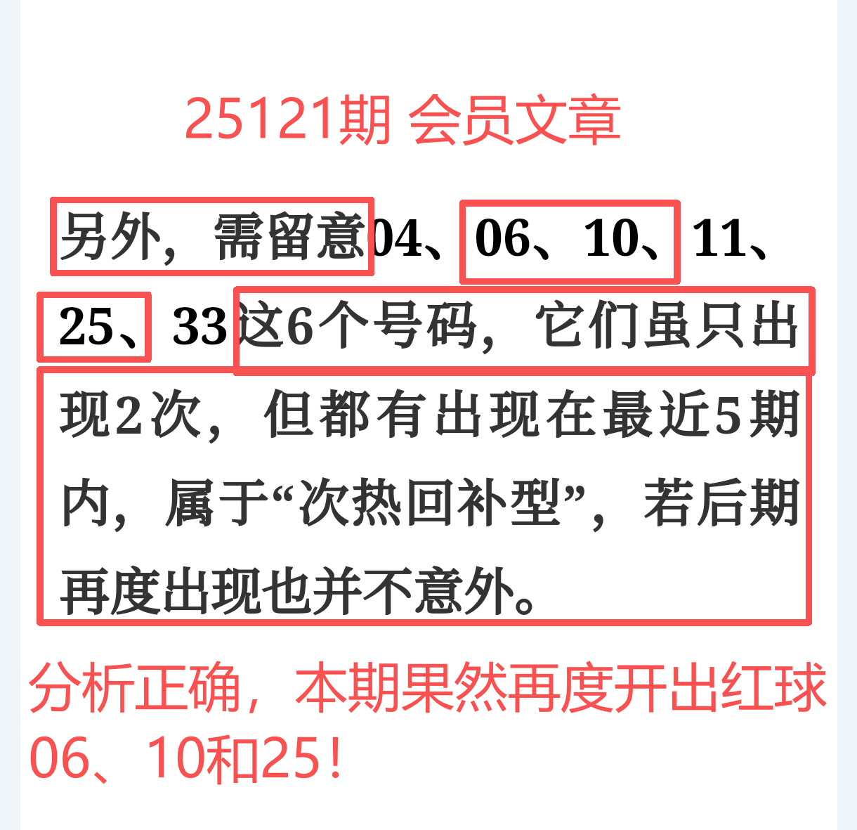 上期免费文章+会员专栏+充电体验卡合计再中5个红球:06、08、10、25、29;