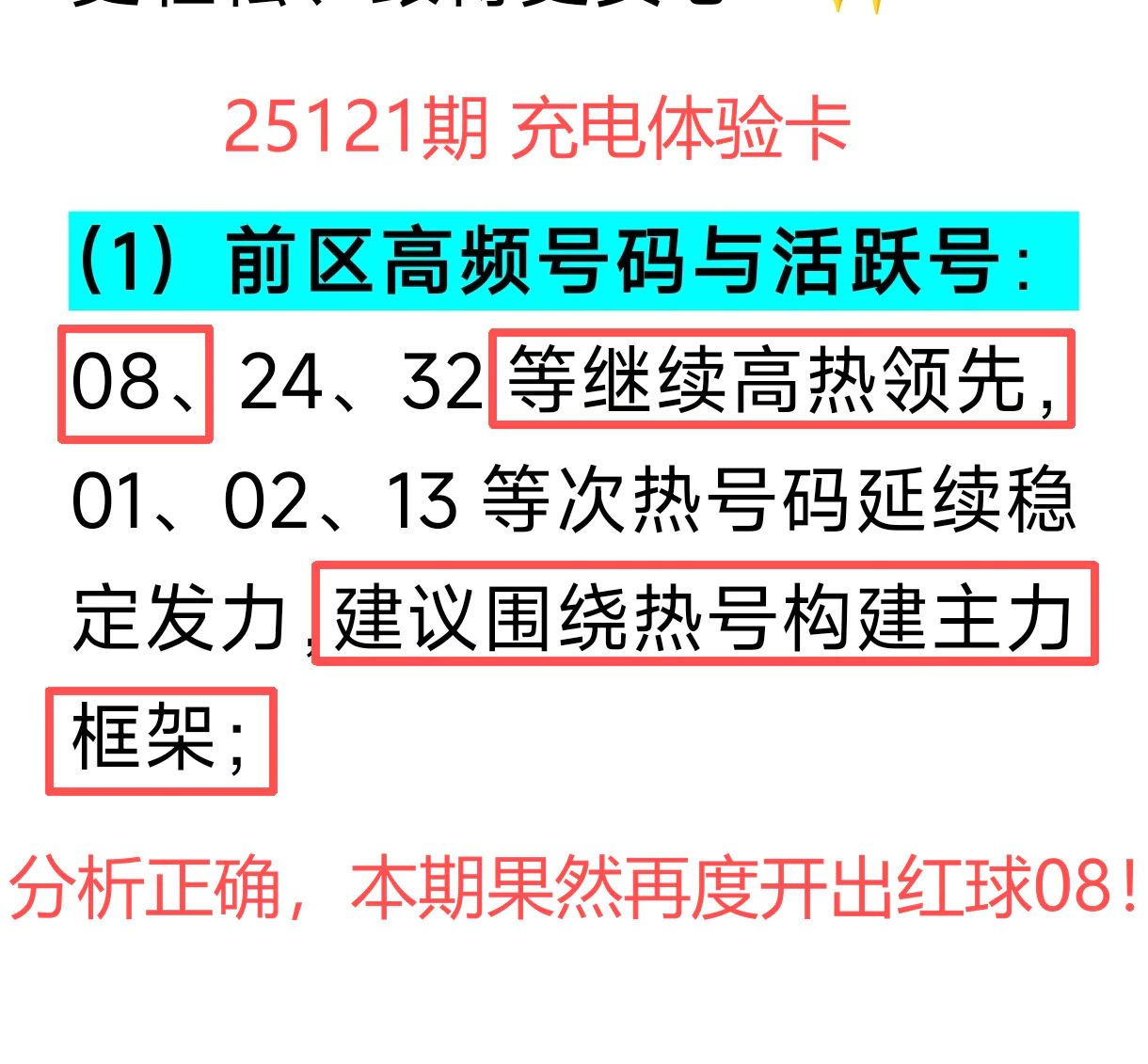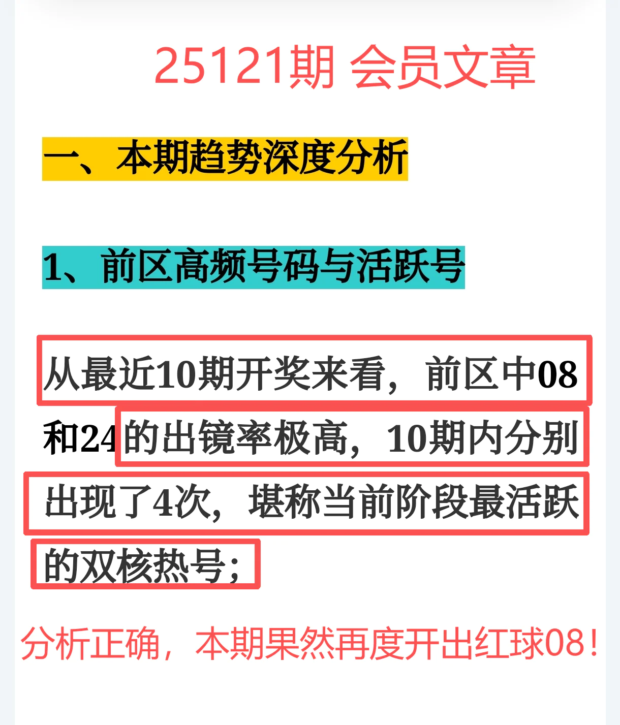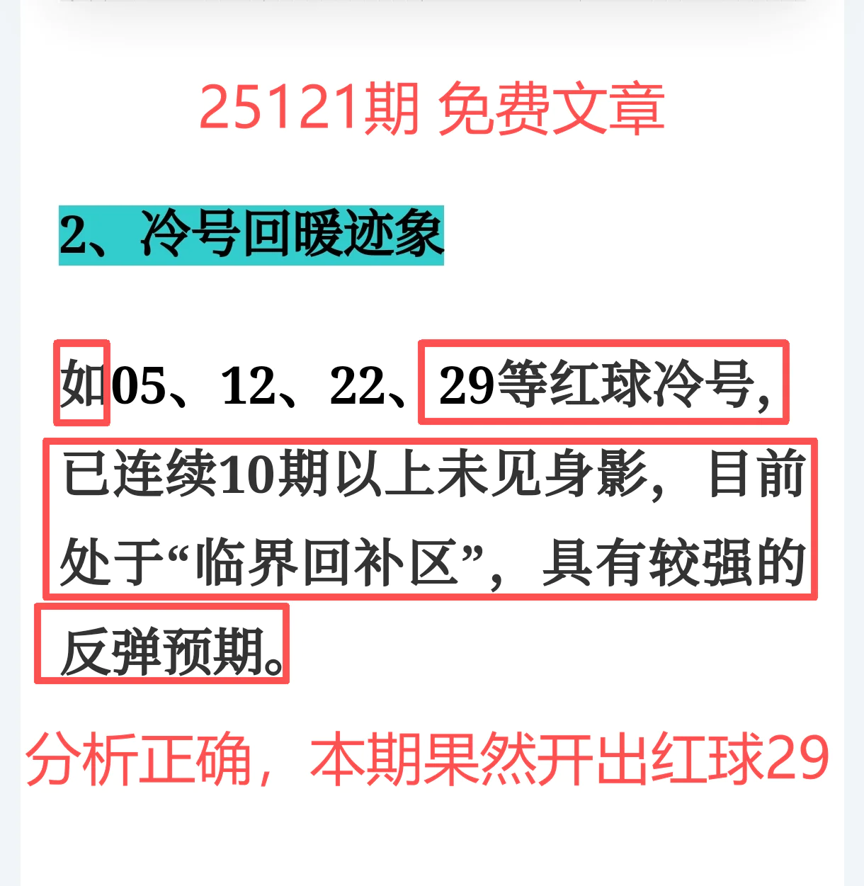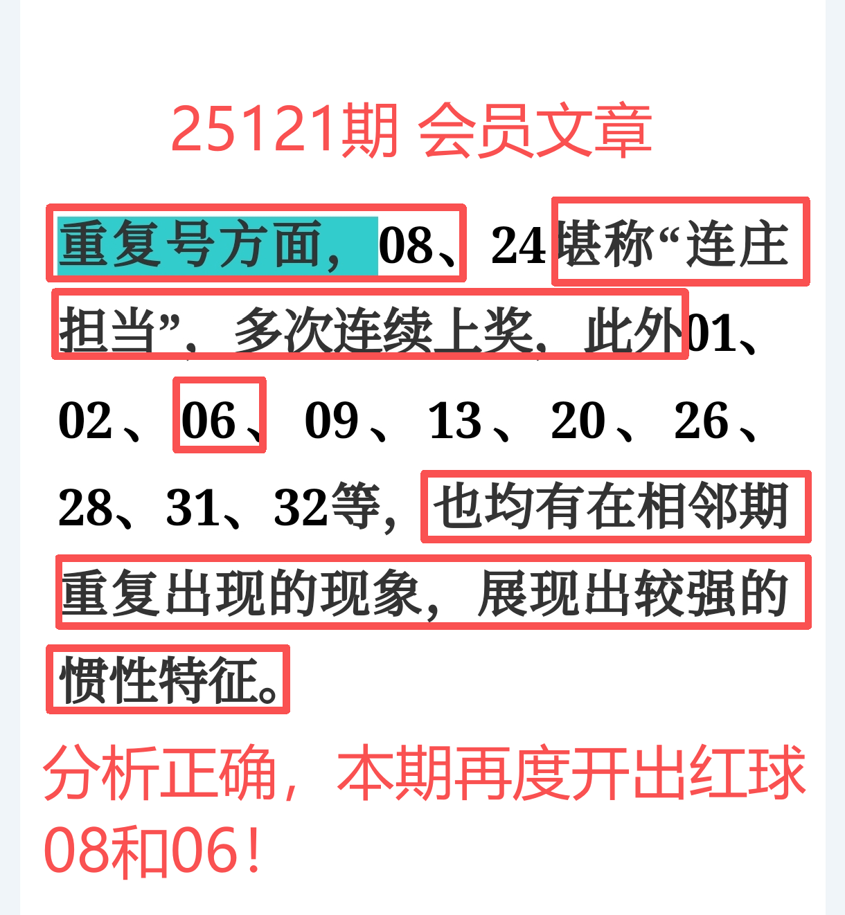 上期免费文章+会员专栏+充电体验卡合计再中5个红球:06、08、10、25、29;