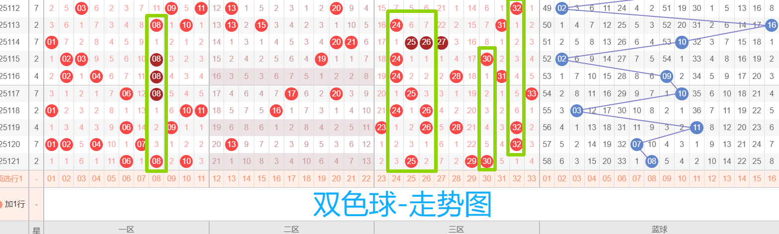 从最近10期数据来看,08、24、25、26、30、32等红球表现活跃,其中08、25、24都出现了3次及以上,属于典型的短期热码。
