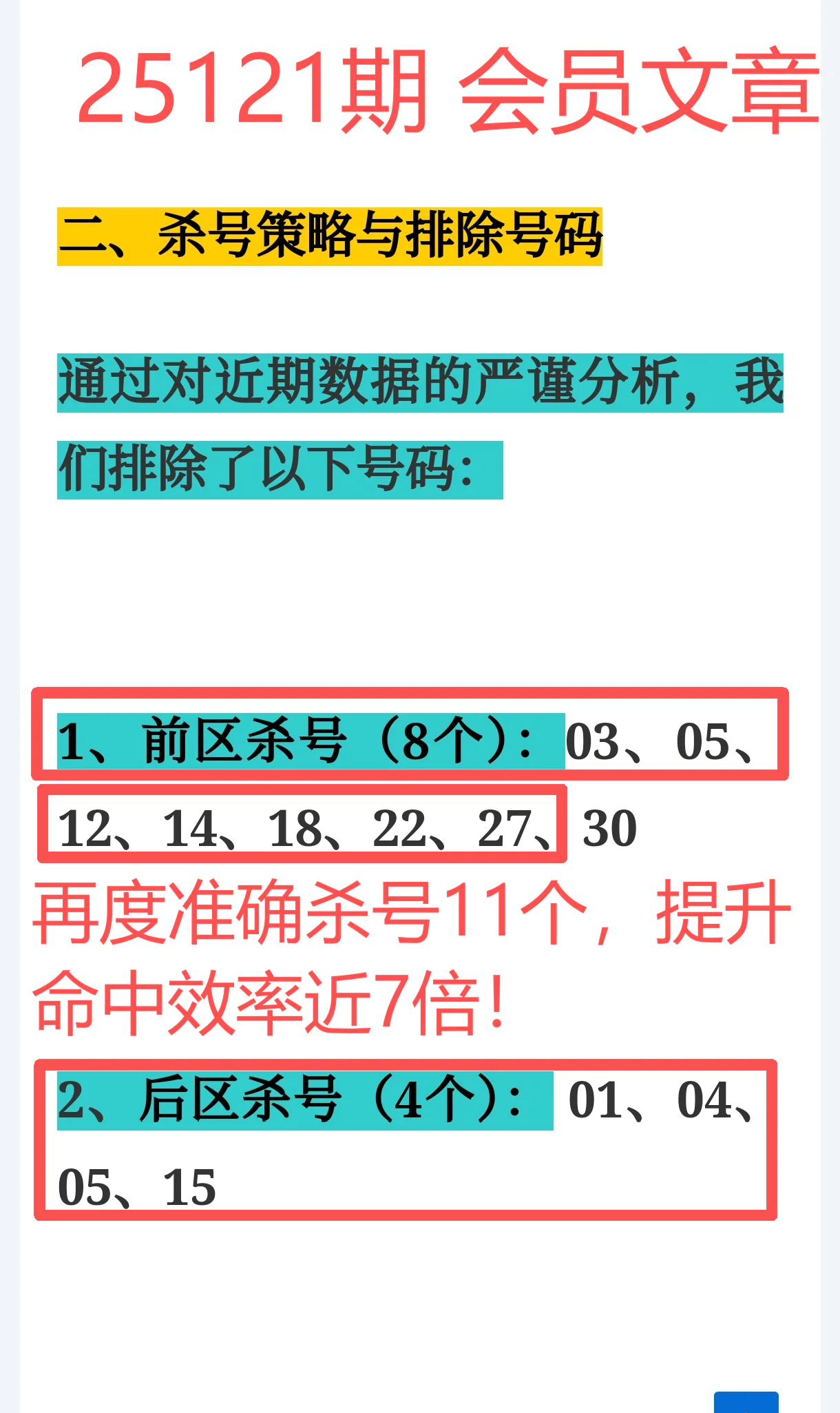 杀号命中11个/共12个,命中效率提升近7倍,整体节奏清晰,重点全面开花!