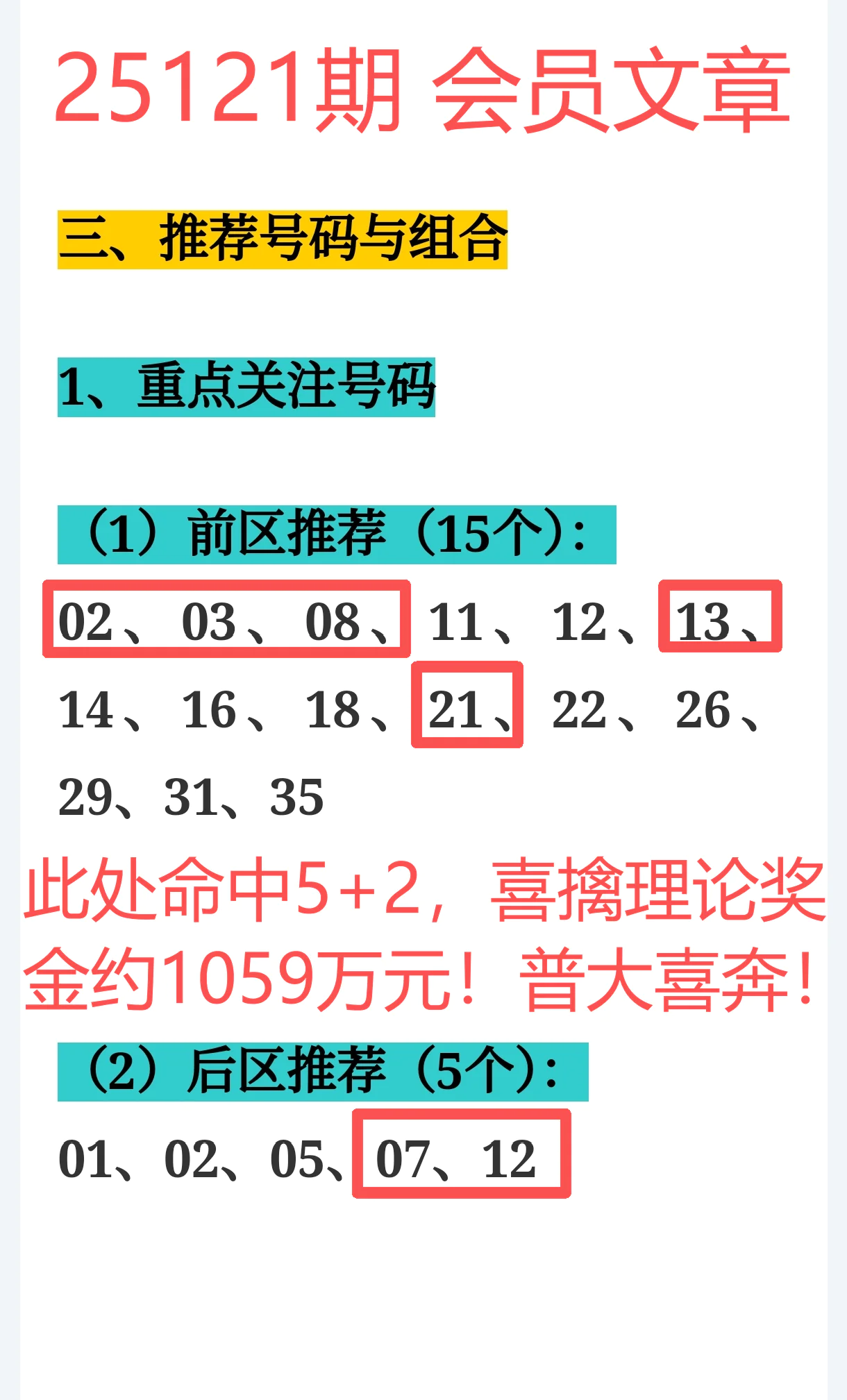 上期开奖号码为:02 03 08 13 21 + 07 12,我们的趋势分析再度火力全开,再中5+2,狂揽1059万元大奖!