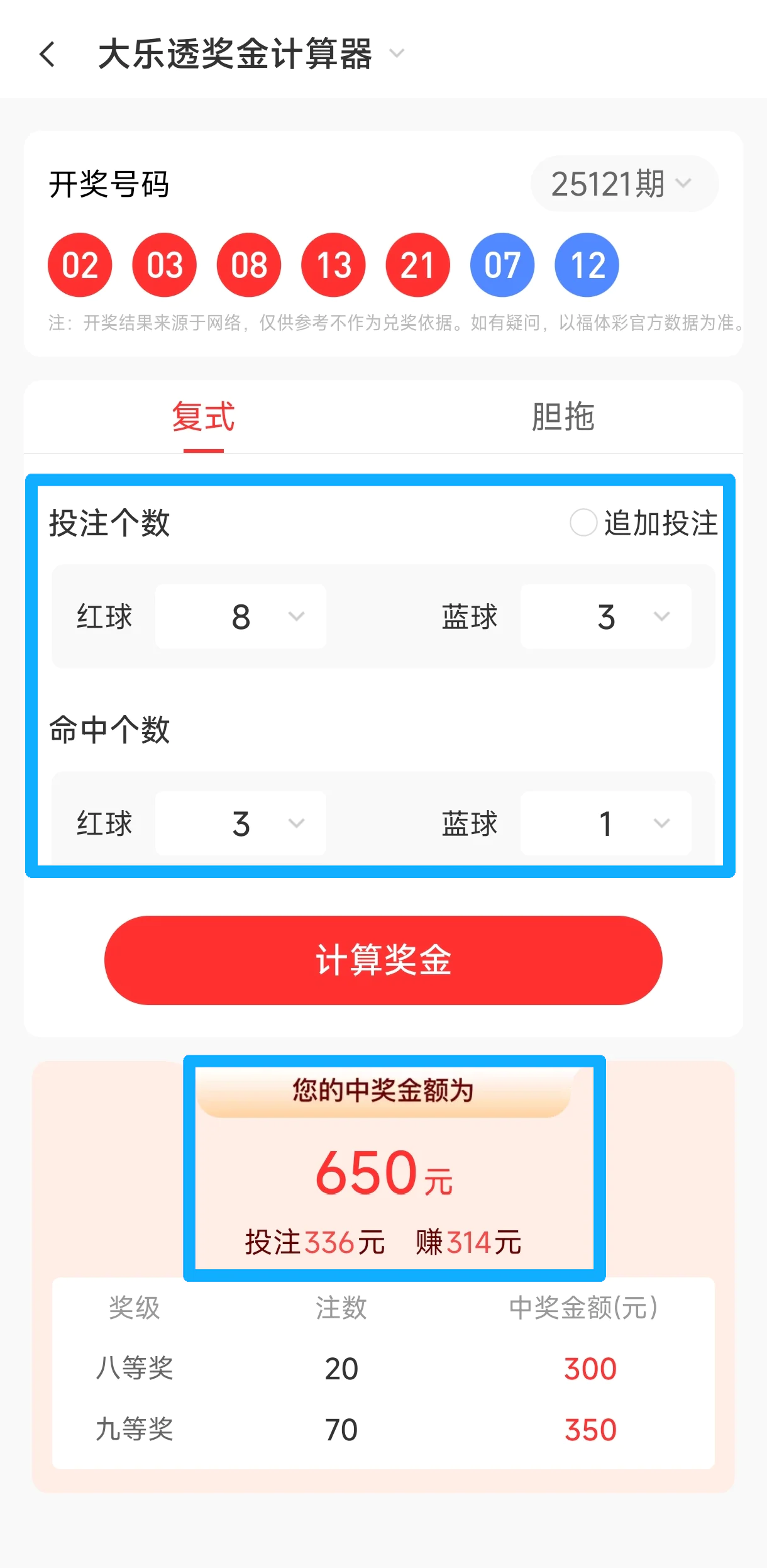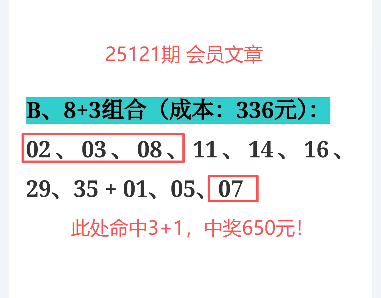 命中3+1(红球02、03、08+蓝球07),中得奖金650元,成本336元,净赚314元小复式再次打出实战高性价比!