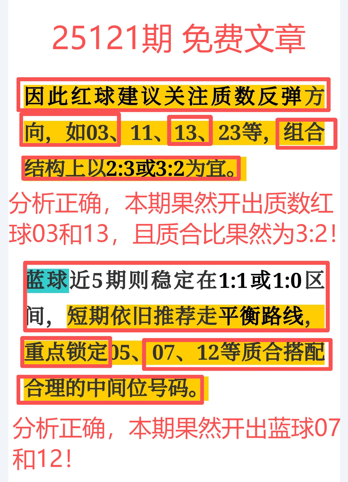 红球03、13作为质数再度爆发,成功把握质合比为3:2的节奏;蓝球07、12双双拿下,结构节奏全面击中!