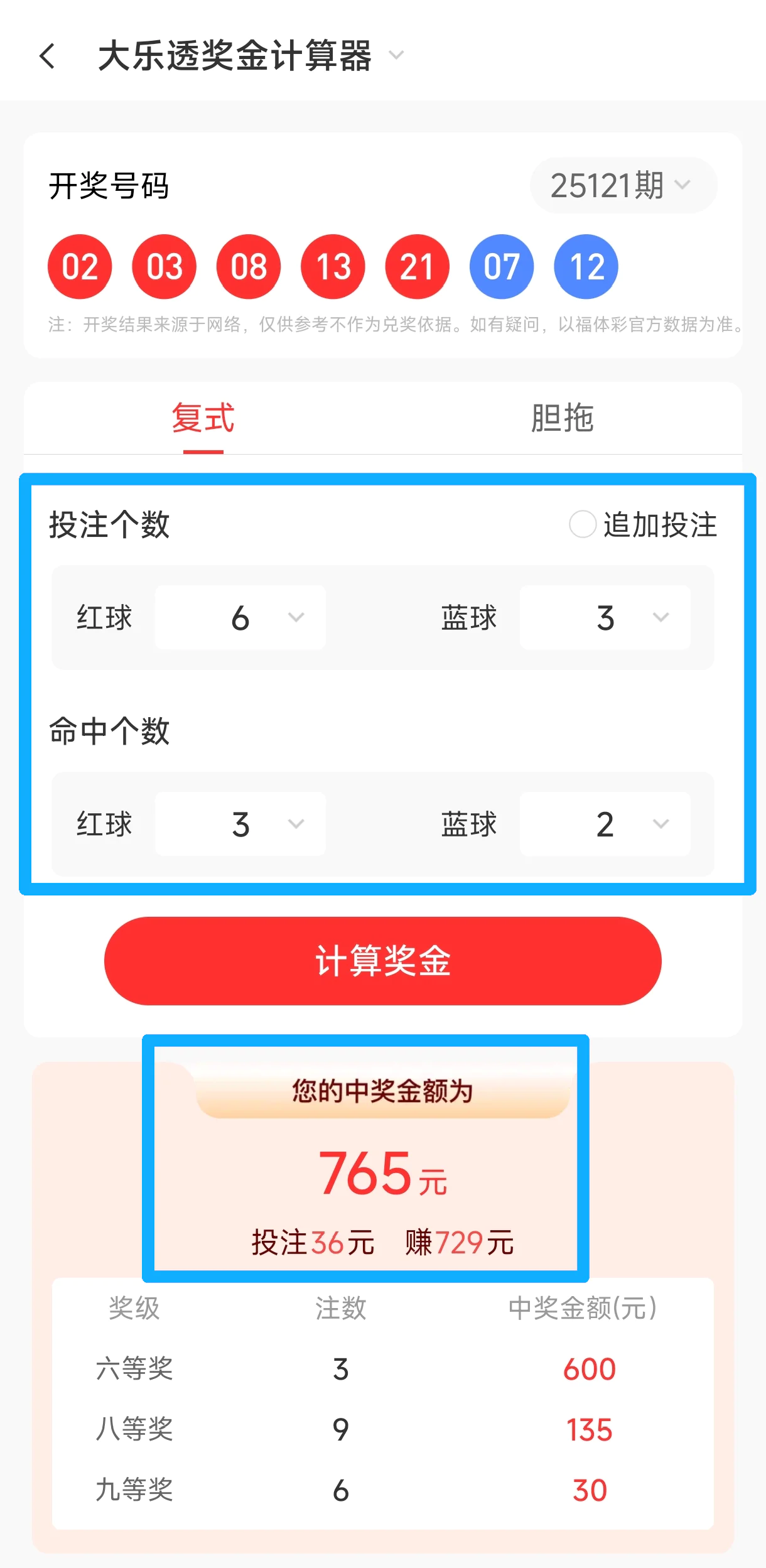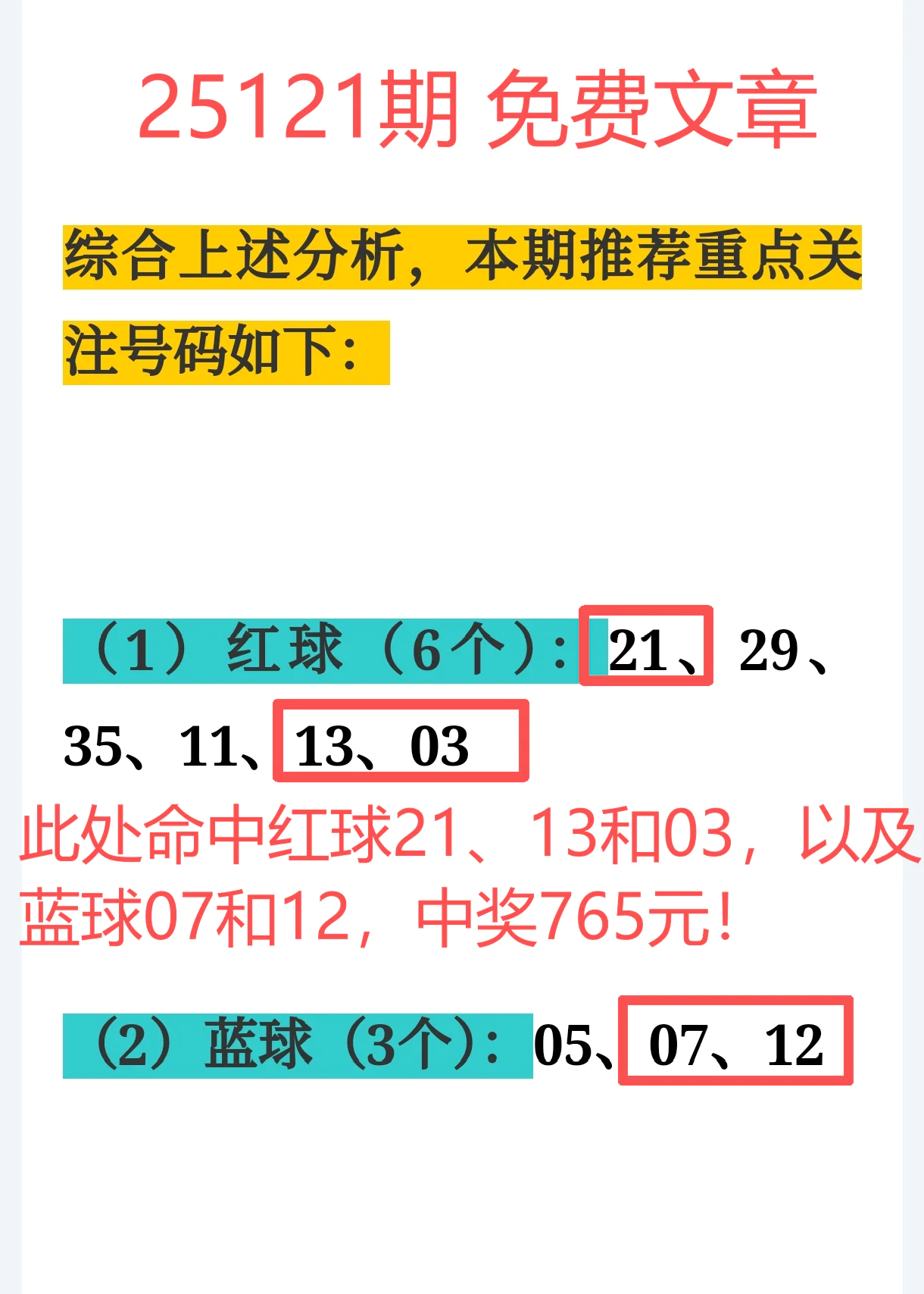 红球21、13、03和蓝球07、12强势上榜,单方案喜中765元,成本仅36元,净赚729元节奏感直接拉满!