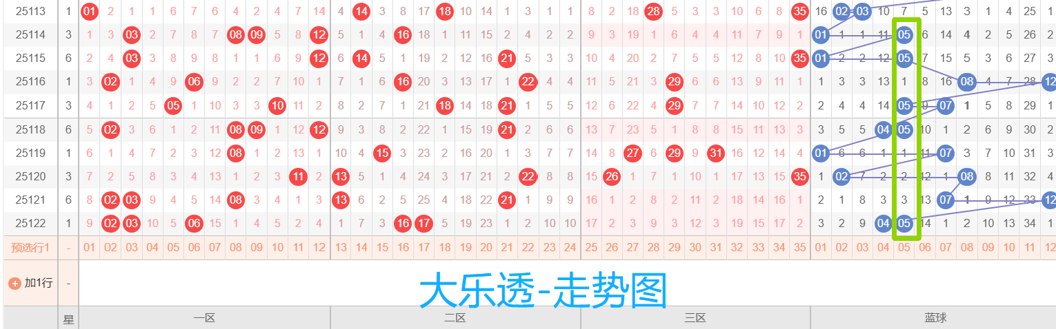 蓝球方面,05在近10期开出5次,火力十足,堪称后区最稳定的“顶流号码”;其余如04、07、08等蓝球热度略有回落,但仍在可关注区间,本期若继续延续蓝区双质走强节奏,05仍有较高再开的潜力。