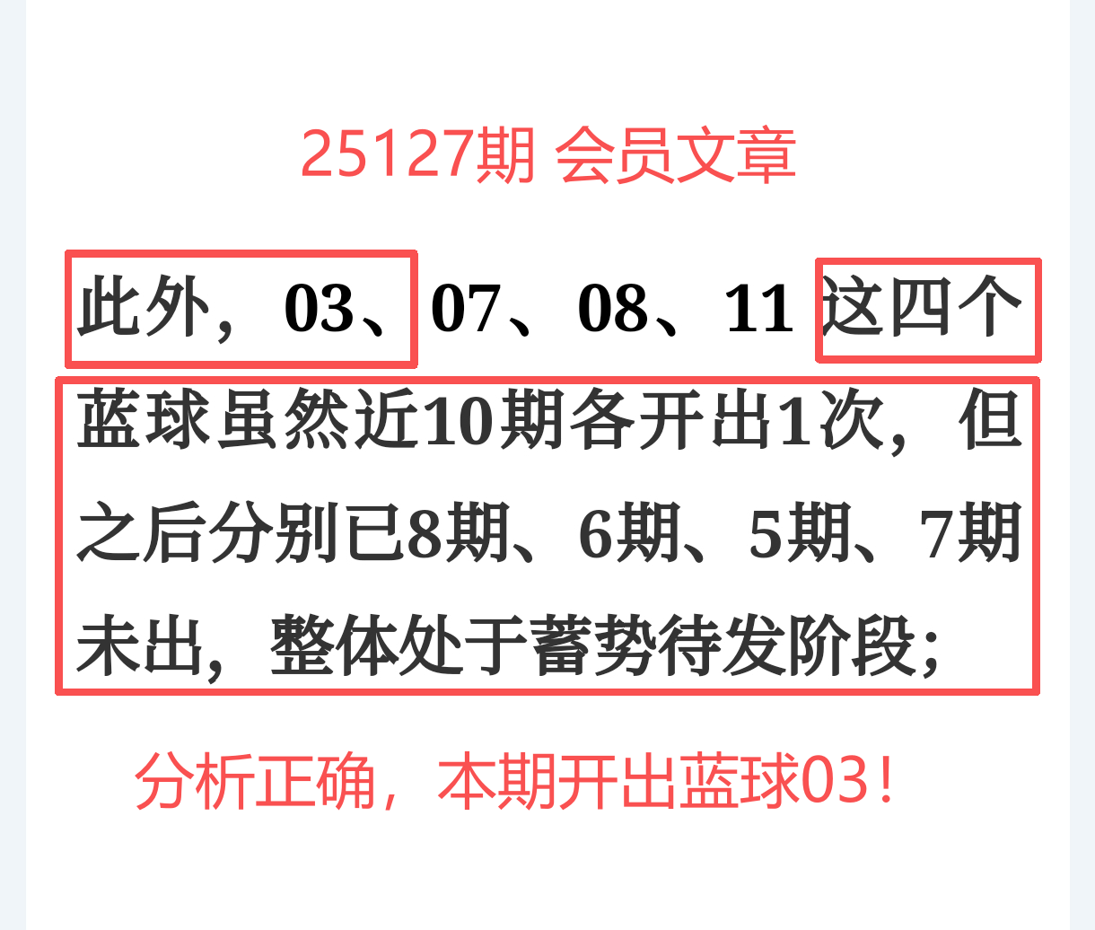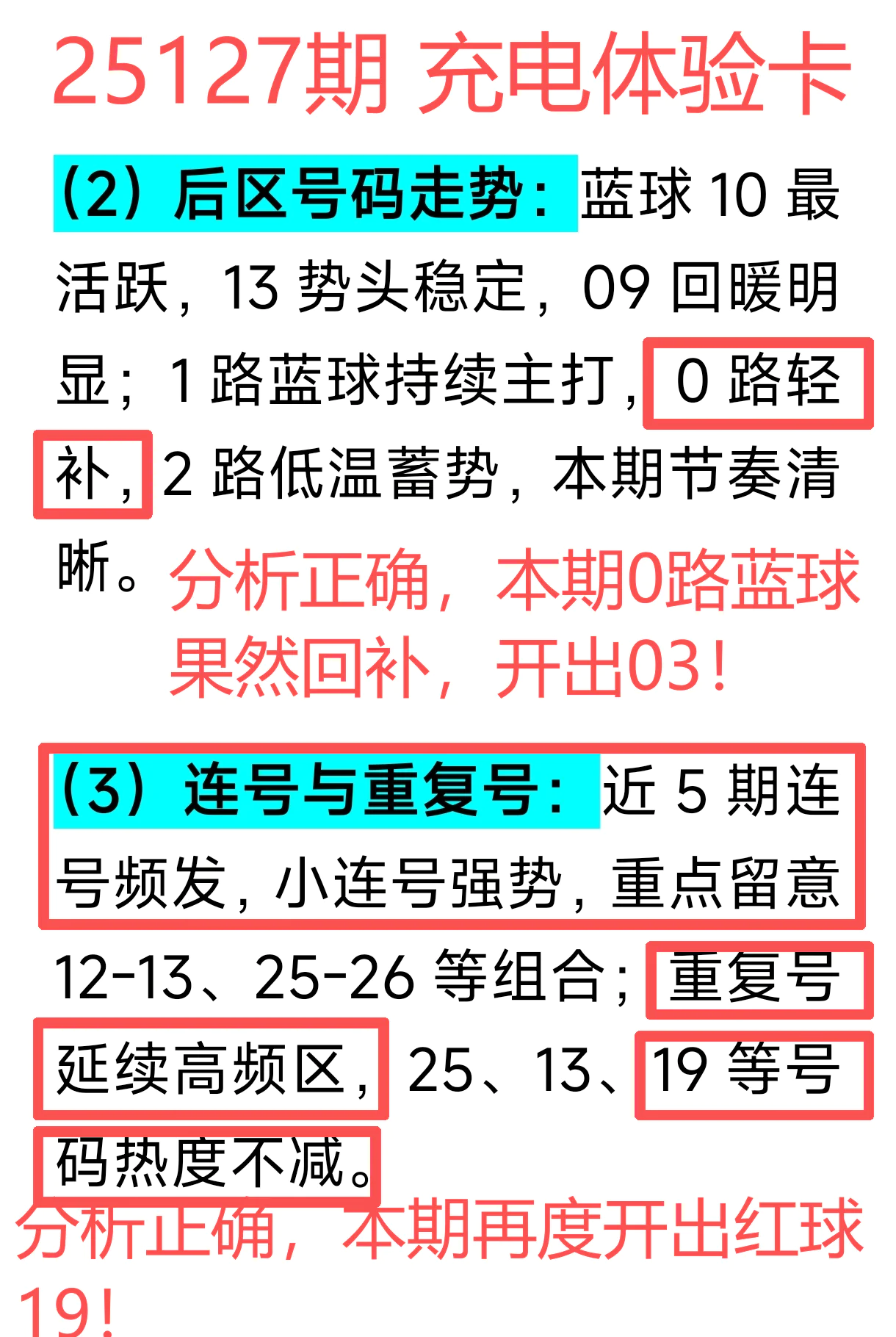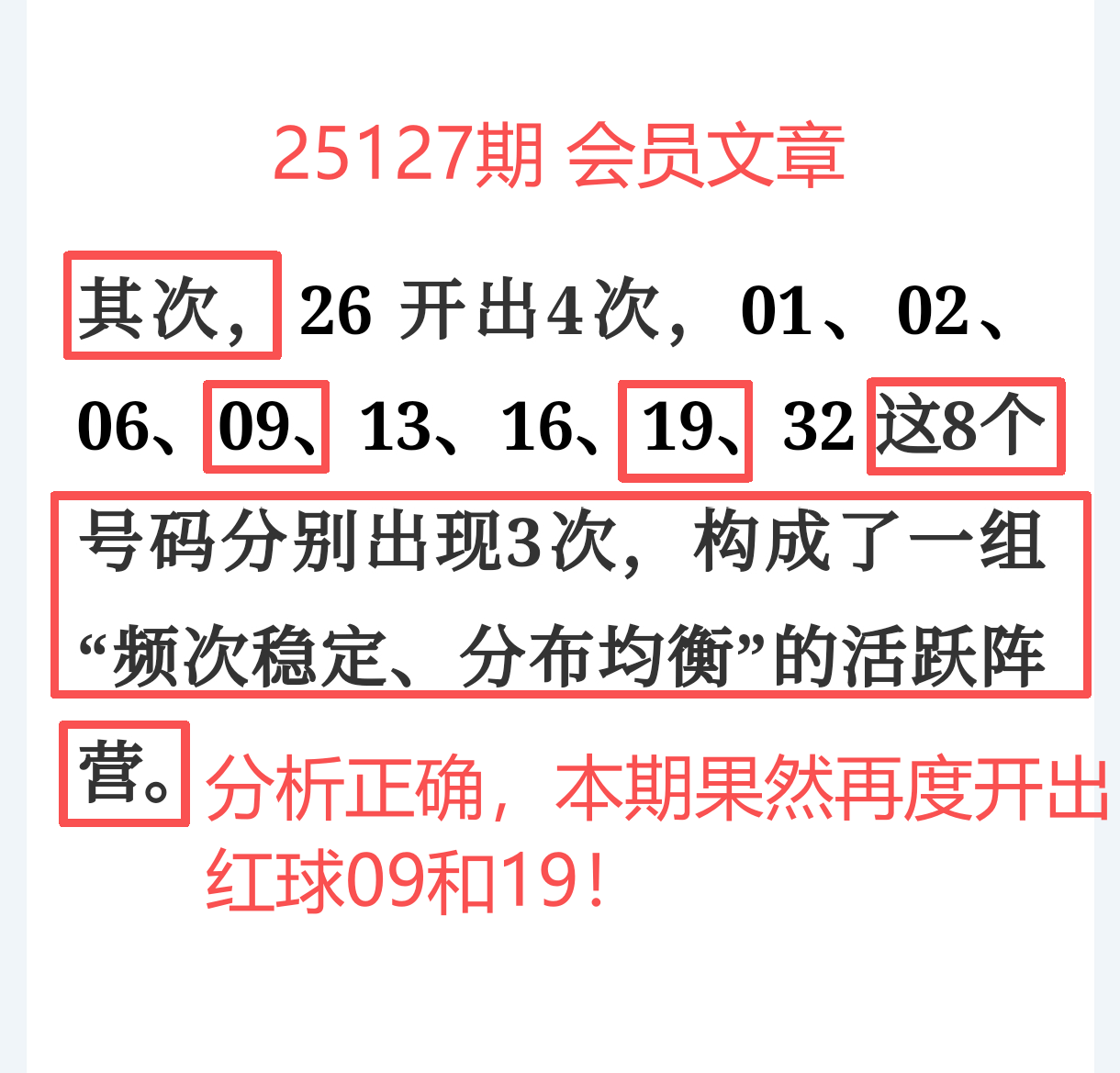 所以,上期免费文章 + 会员文章 + 充电体验卡 共命中5个号码:红球03、09、19、28和蓝球03,同时再度准确杀号10个,命中效率提升近6倍,整体表现依旧坚挺!