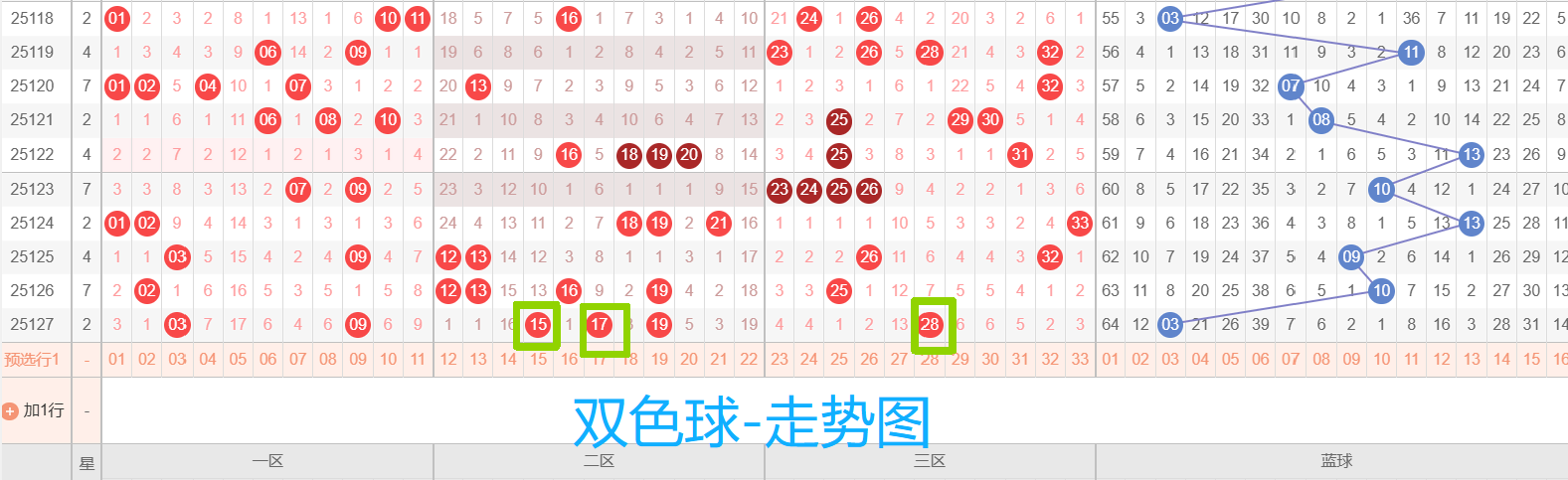 关键词:双色球、杀号、高频热号、连号和重复号、跨度、区间比、012路、质合比、冷号回暖、复式、胆码、走势