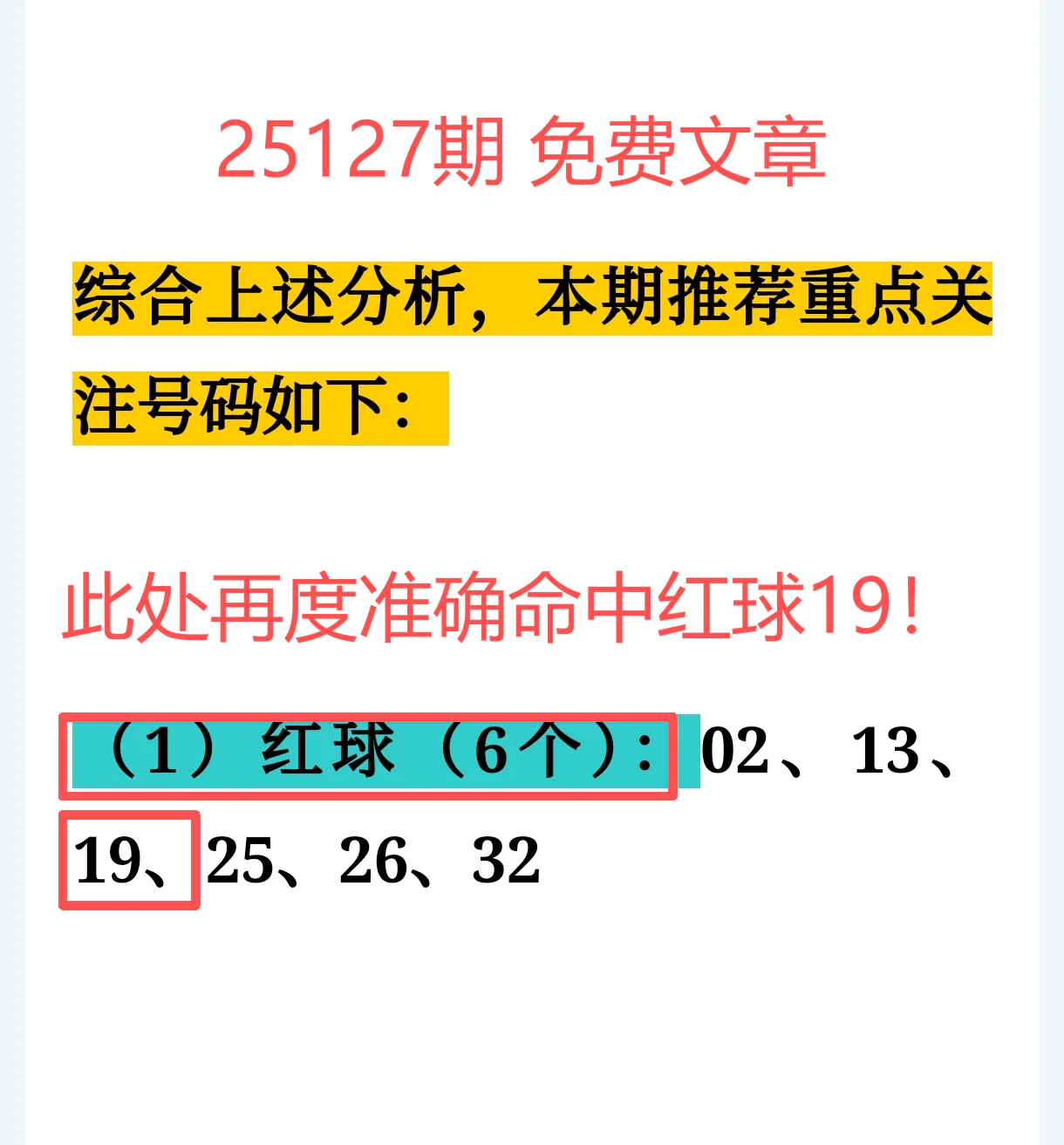 3、重点号码推荐: 红球19强势兑现,继续证明我们识爆点的眼光!