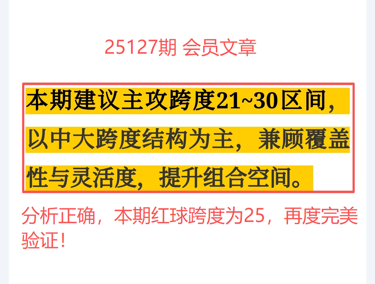 上期红球跨度为25(28-03=25),精确落在我们建议的主攻区间“21~30”内,跨度节奏再次命中!