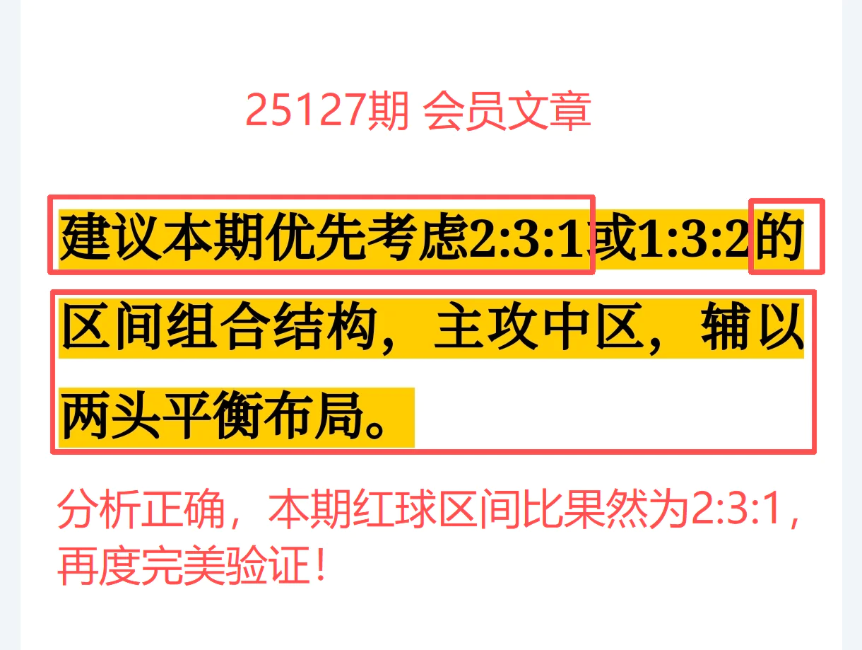 命中红球区间比2:3:1,结构分布清晰合理,与分析节奏高度一致!