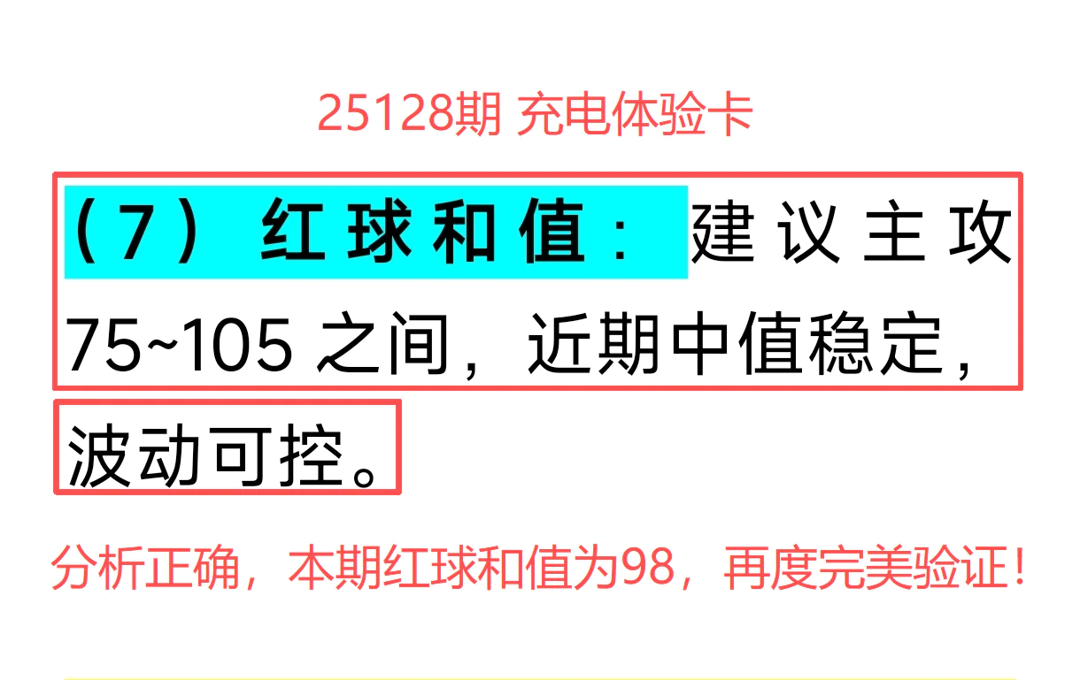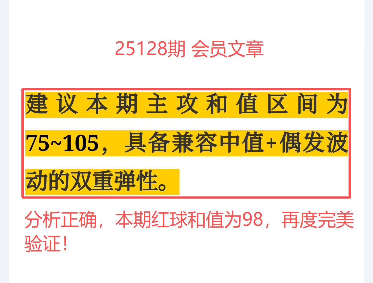 上期红球和值为98,稳稳落在建议区间“75~105”之内,节奏踩点精确,逻辑再次印证!
