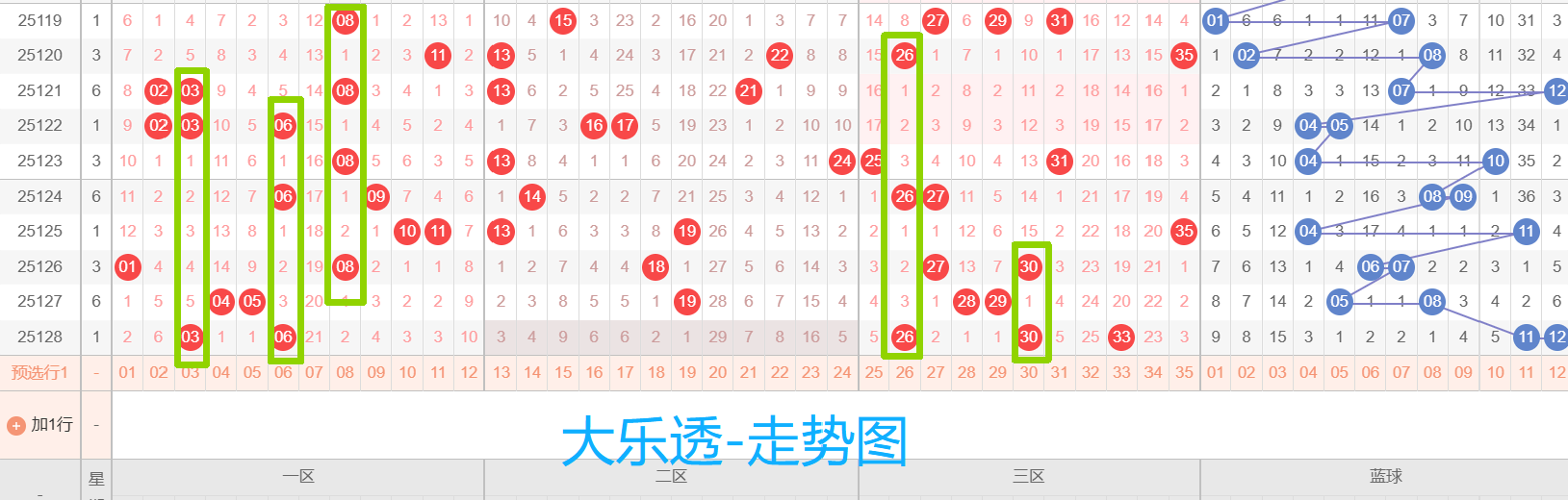 上期开奖号码为 03 06 26 30 33 + 11 12,我们的趋势分析再度打出漂亮节奏!从红球到蓝球,从连号到冷热号,多个板块齐爆点,下面快速带你回顾: