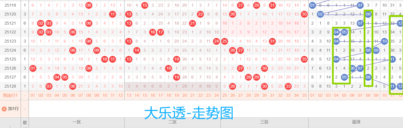 关键词:大乐透、杀号、高频热号、冷号回暖、连号和重复号、跨度、区间比、012路、质合比、复式、胆码、走势