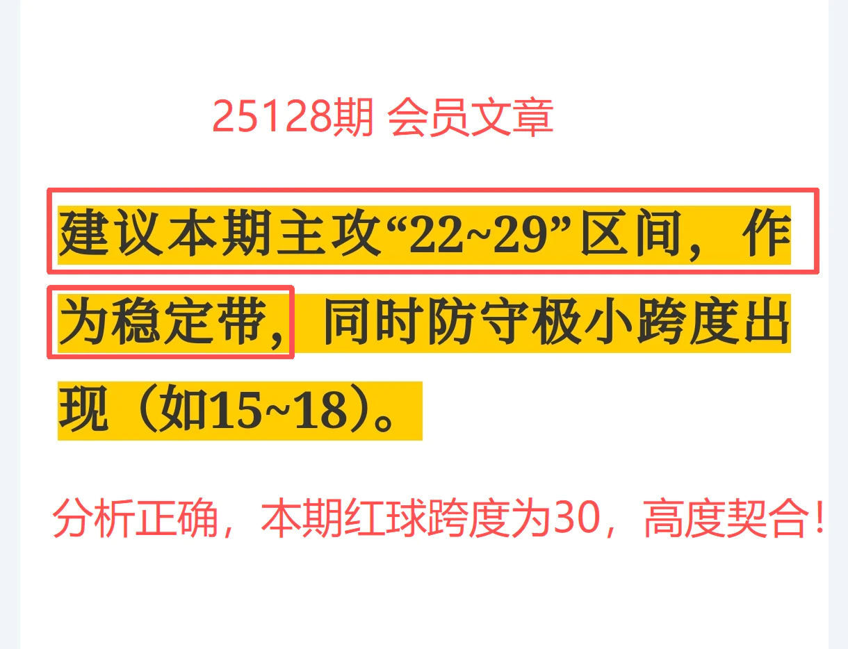 上期红球跨度为30,与我们建议的主攻区间“22~29”高度契合,节奏判断贴合实战,值得持续参考;