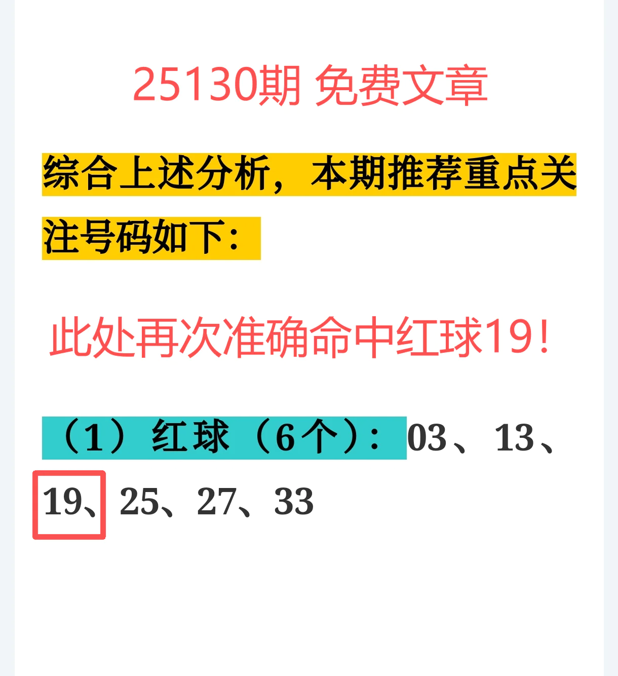 4、推荐重点关注号码:再中红球19!重点推荐再中一枚关键红球!