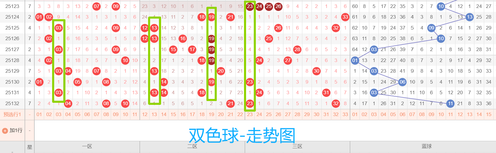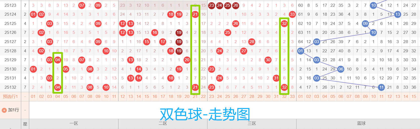 不少前期遗漏较多的冷码,比如 04、21、32 等号码,近期均实现突然补位,尤其是 21 与 32 前期遗漏均超过 6期,属于典型的“深度冷号回暖”。