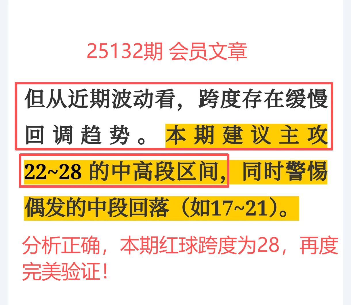 上期红球跨度为28(32-04=28),精确落在我们建议的主攻区间“22~28”之内,再次验证我们对跨度区间的把握节奏稳定,实战命中再加一分;