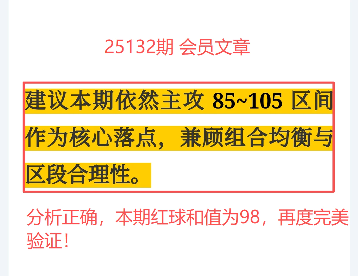 上期红球和值开出98,完美踩中我们建议的“85~105”区间,再添一笔稳中;