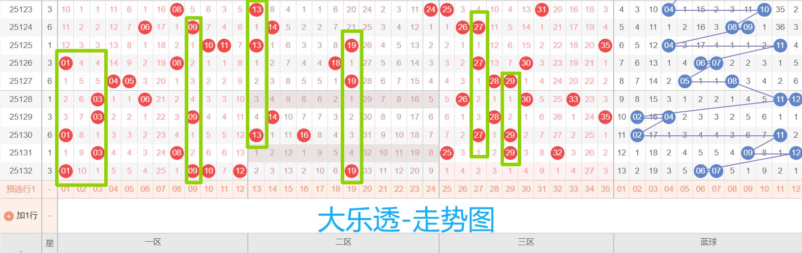 关键词:大乐透、杀号、高频热号、冷号回暖、连号和重复号、跨度、区间比、012路、质合比、复式、胆码、走势