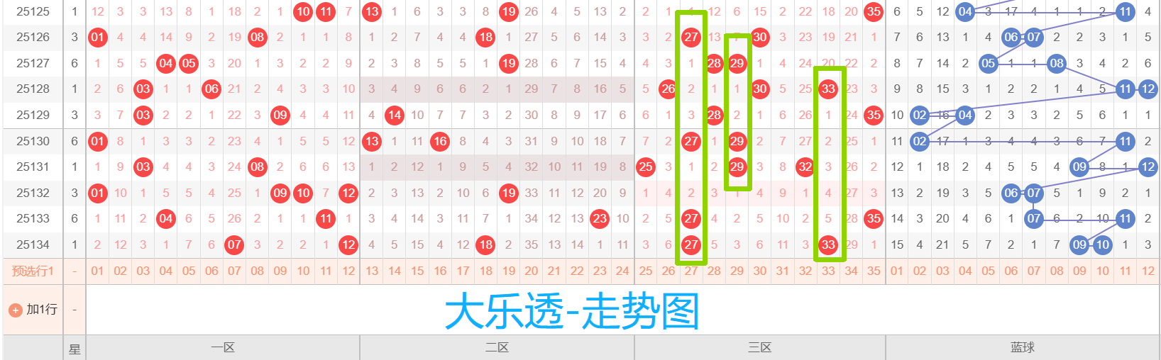 红球29、33也都有2次及以上的表现,体现出一定的连贯性;