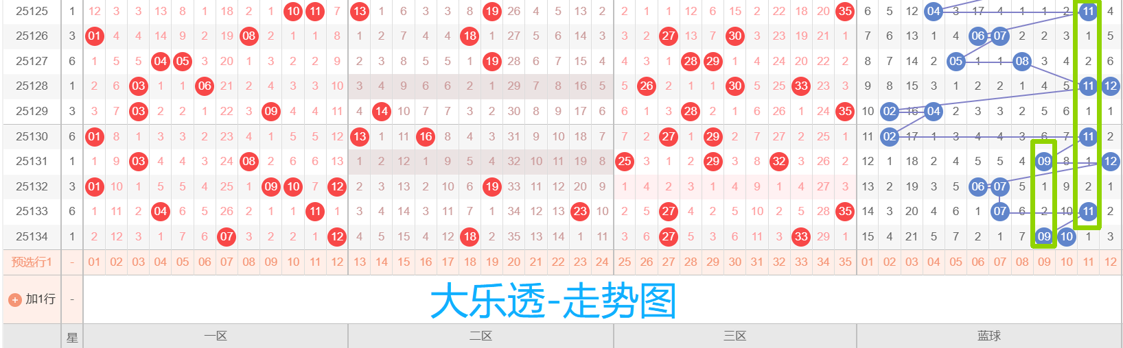 关键词:大乐透、杀号、高频热号、冷号回暖、连号和重复号、跨度、区间比、012路、质合比、复式、胆码、走势