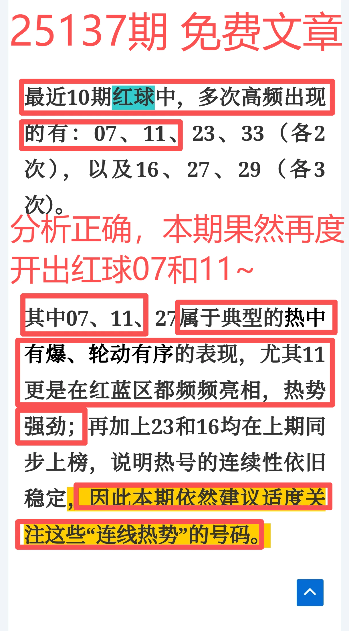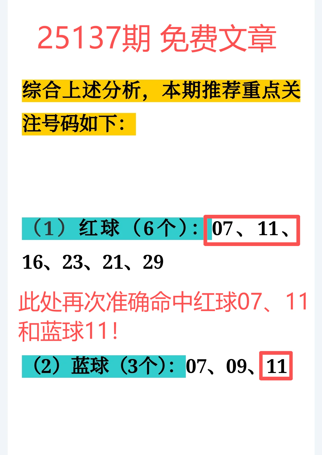 红球07、11 + 蓝球11 全部上榜,说明咱们的免费文也是真材实料,不马虎!