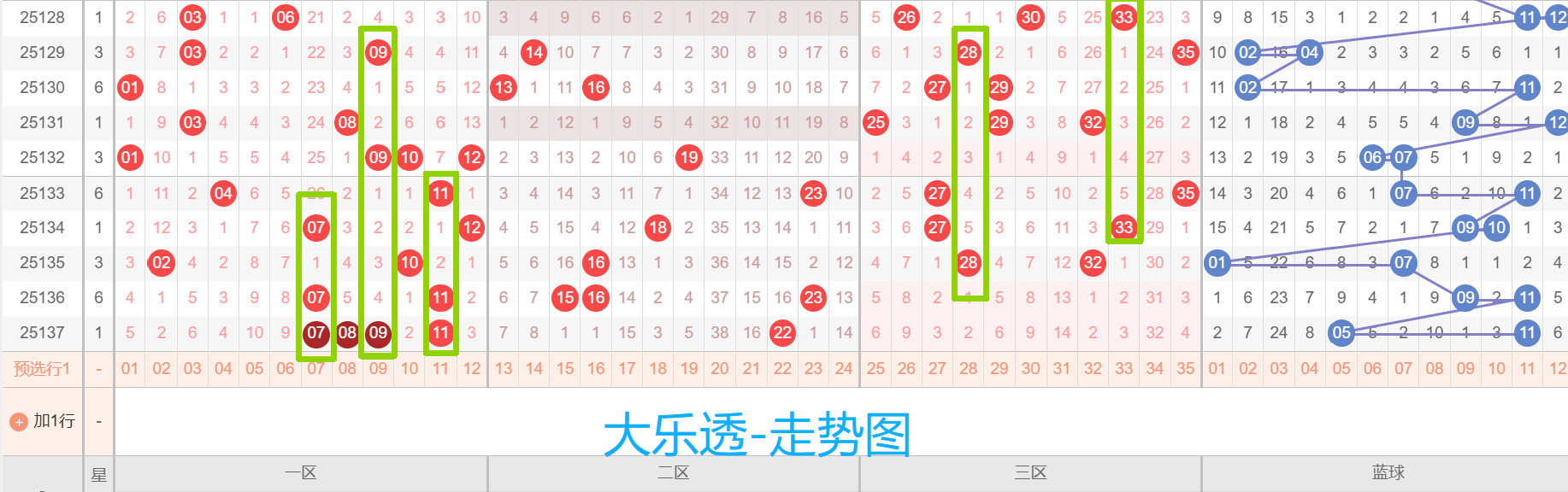 ✅ 建议红区继续重点留意低位热号07、11,以及温热区的09、28、33;蓝区则以11为首要重点,同时留意是否有新热号如09、10等尝试上位。