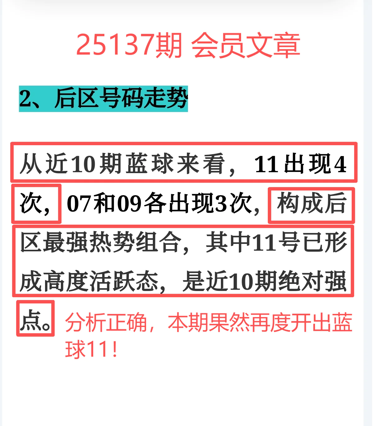 蓝球11(热)+ 蓝球05(冷)双双命中,冷热结合的策略再次爆点,会员文章这块稳得没话说!
