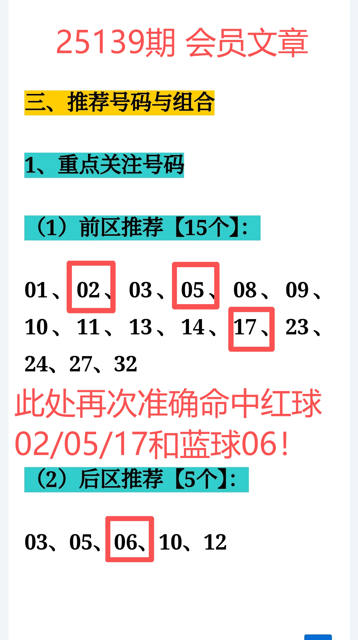 ✅ 重点号码命中:红球命中02、05、17,蓝球命中06,重点池稳稳兑现;