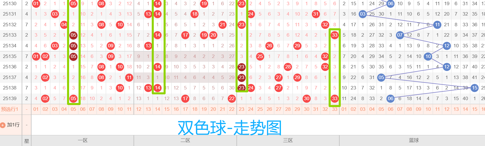 从近10期走势来看,红球 05 已经连续多期开出,热度持续不减,近10期更是出现了 5次,属于典型的“强势热号+惯性延续”结构;而 23、14、33 同样多次上榜,近期热号带动力明显增强,呈现出“中大号偏活跃、热号持续控场”的典型走势。